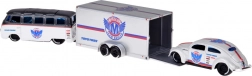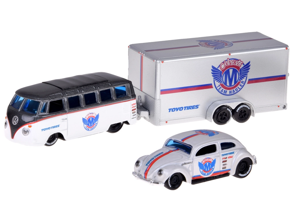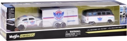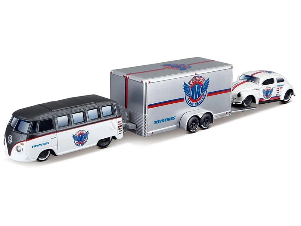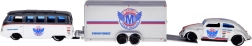 Der VAN SAMBA zieht einen geschlossenen Anhänger; der Anhänger kann abgekoppelt und der Kupplungshaken demontiert werden. Der BEETLE passt sicher auf die Rampe für einfaches Aufladen.