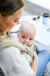 Tragen Sie Ihr Kind vorne ab ca. 3 Monaten und auf dem Rücken etwa ab 12 Monaten. Abnehmbare Kapuze, Tasche und Gummibänder an den Gurtenden erleichtern die tägliche Nutzung.