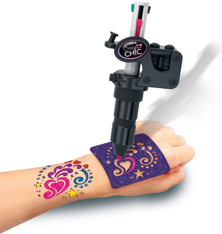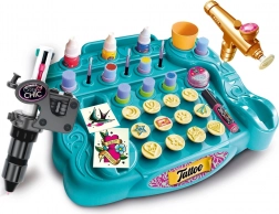 Kreieren Sie temporäre Tattoos ganz nach Ihrer Fantasie. Mit dem Crazy Chic Tattoo-Studio können Kinder Motive frei Hand zeichnen, selbstklebende Schablonen verwenden oder Muster mit Stempeln aufbringen. Im Set ist alles an einem Ort – Farben, Glitzer, Werkzeuge und Hilfsmittel für eine einfache Anwendung.