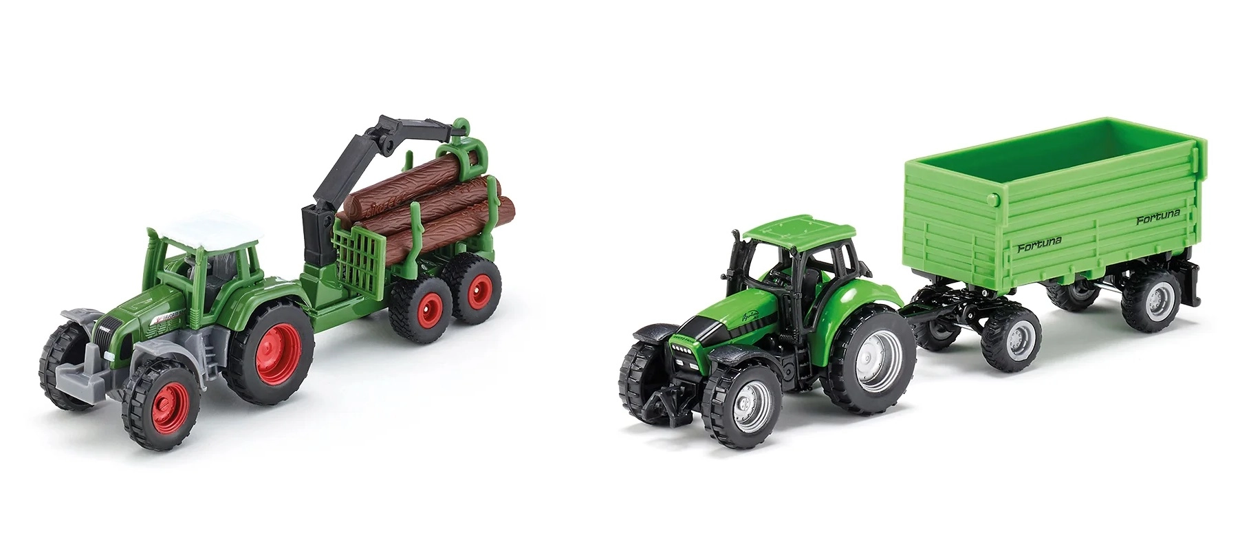 Das Set beinhaltet einen Traktor mit Kippmulde und einen Traktor mit Holzstamm-Anhänger und Ladearm für maximale Spielvielfalt.