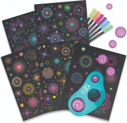 - 48 schwarze Seiten, Spiralschablone mit 7 Zahnrädern, 6 neonfarbene Gelstifte, Stickerbogen
