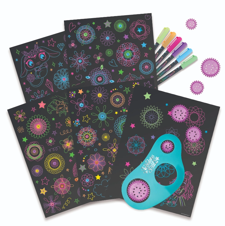 - Einfach und unterhaltsam – Zahnrad in die Schablone einsetzen, mit dem Neonstift zeichnen und beobachten, wie faszinierende Spiralen entstehen.