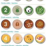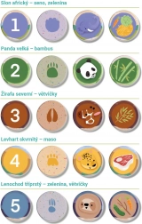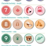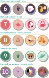 Runde Marker mit Futter und Tierköpfen helfen Kindern, richtig zuzuordnen, was welches Tier frisst und welche Spuren es hinterlässt.