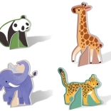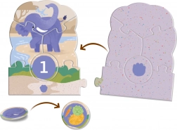 Extra große, 2 mm starke Kartonteile lassen sich leicht greifen, passen gut zusammen und halten auch häufigem Spielen stand. Außerdem enthalten sind vier separate Tierfiguren für freies Spiel sowie ein Elternratgeber mit Ideen für Spielvarianten.