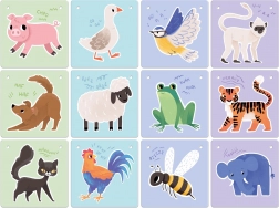Dieses Set großformatiger Karten wurde für die spielerische Sprachstimulation in der Phase entwickelt, in der Kinder zunächst Laute nachahmen und erst danach Wörter bilden. Klare, gut verständliche Illustrationen mit grafischen Hinweisen motivieren Kinder, Laute wie „miau“, „brumm“ oder „wau“ zu wiederholen und trainieren so ganz natürlich die auditive Unterscheidung, das Gedächtnis und den Rhythmus der Sprache.