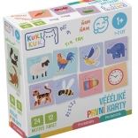 Im Alter von 12–30 Monaten wird die Sprachentwicklung am stärksten durch die Nachahmung von Lauten beeinflusst. Das Wiederholen von Lauten stärkt die Sprechmotorik (Lippen, Zunge, weicher Gaumen), hilft, Melodie und Tempo der Sprache wahrzunehmen, und legt die Grundlagen für den Wortschatz. Die Karten dienen somit als Brücke von Lauten zu den ersten Wörtern.