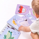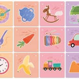 Jede Karte misst 15,5 × 15,5 cm und besteht aus 2 mm starkem FSC-Karton ohne Plastik – dadurch sind die Karten stabil und sicher und für den täglichen Gebrauch geeignet. Das Set enthält 12 beidseitig bedruckte Karten (insgesamt 24 Motive: 12 Tiere + 12 Gegenstände) sowie Tipps für Eltern mit Spielideen und Förderaktivitäten.