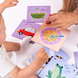 Das Hantieren mit den stabilen Karten unterstützt den Griff, die Auge-Hand-Koordination und die Konzentration beim gemeinsamen Spiel von Eltern und Kind.