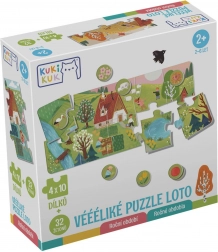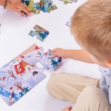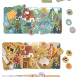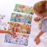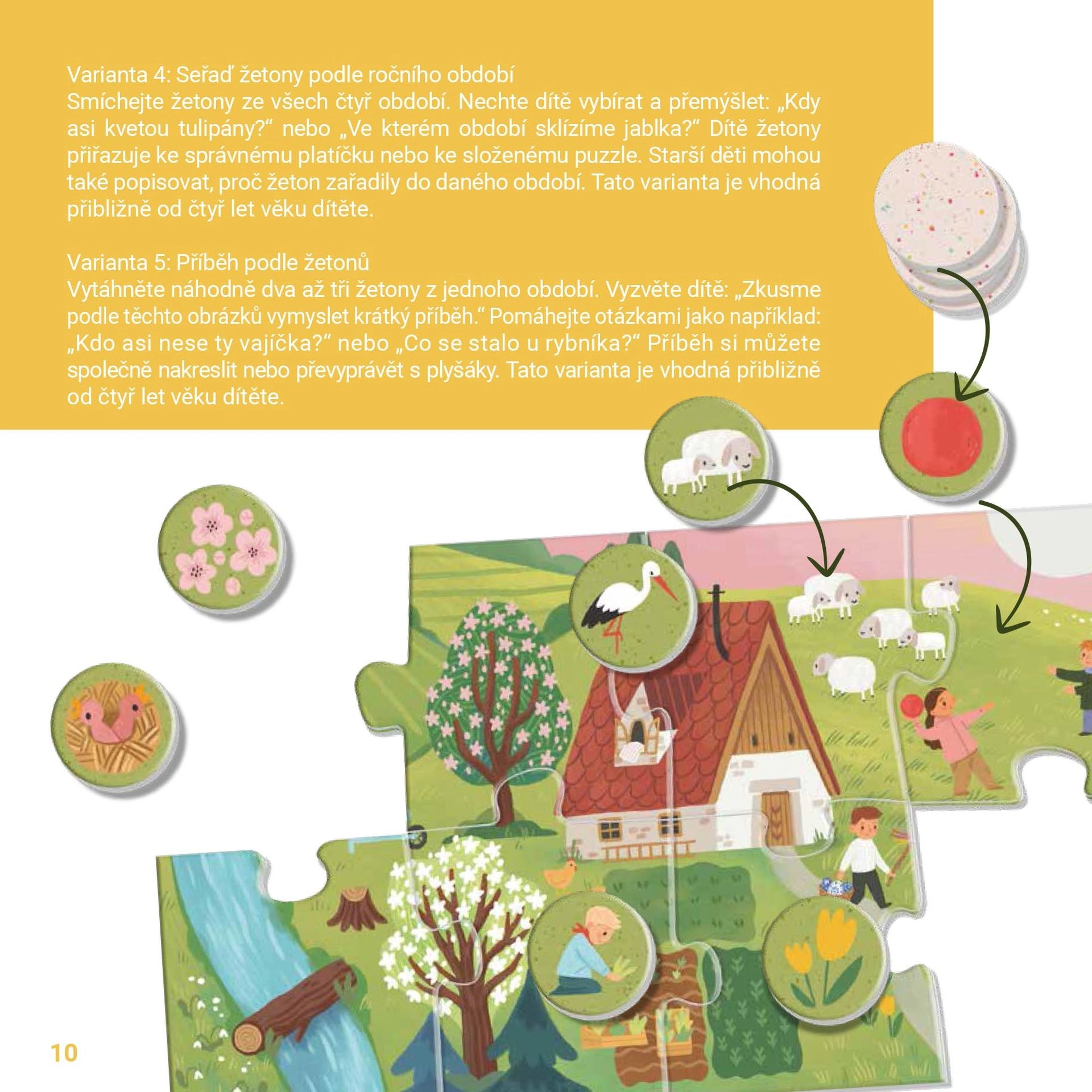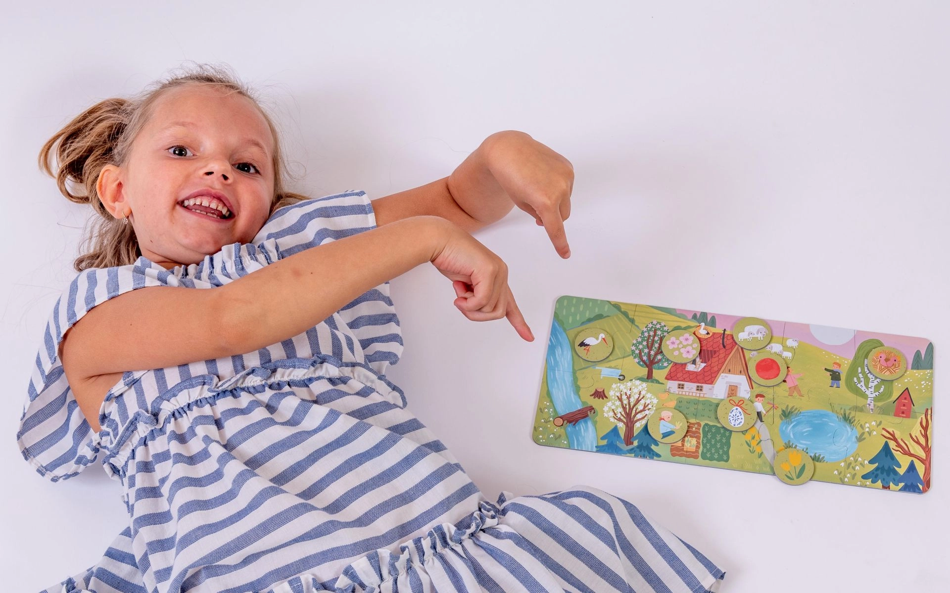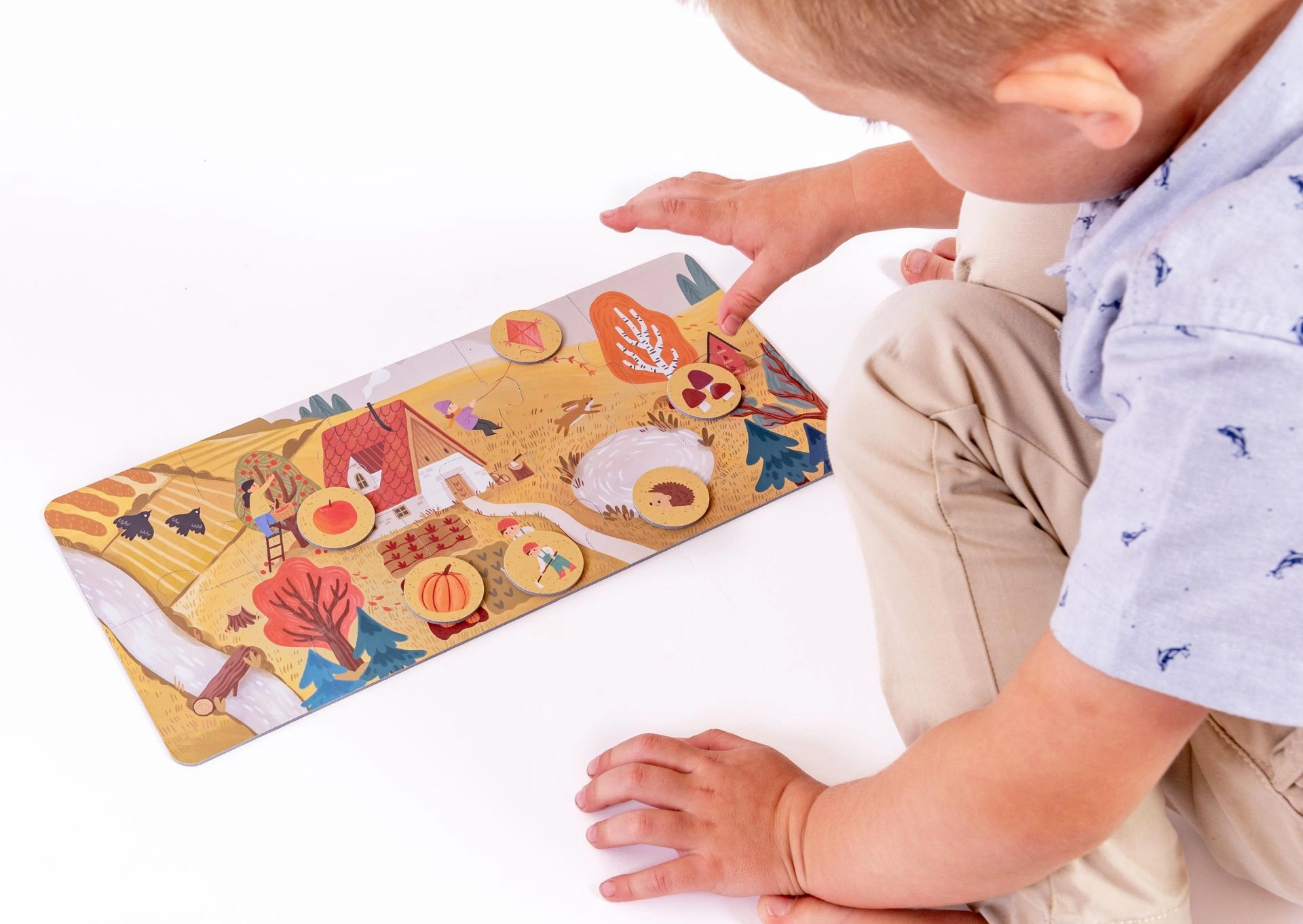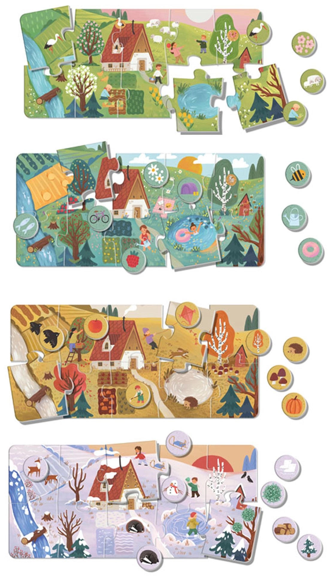 Das große Puzzle-Lotto Jahreszeiten KukiKuk bietet vier wunderschöne Szenen – Frühling, Sommer, Herbst und Winter. Jede Jahreszeit wird aus 10 großen Teilen zusammengesetzt, anschließend werden 8 runde Marken mit typischen Motiven zugeordnet. Dank der Montessori-Prinzipien entdecken Kinder selbstständig, sortieren und verknüpfen Elemente nach ihrer Sinneswahrnehmung.