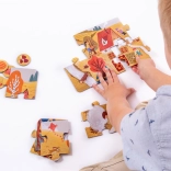 Extra große Puzzleteile aus 2 mm FSC-Karton sind griffig, lassen sich leicht zusammensetzen und halten dem täglichen Spiel stand – ganz ohne Plastik.