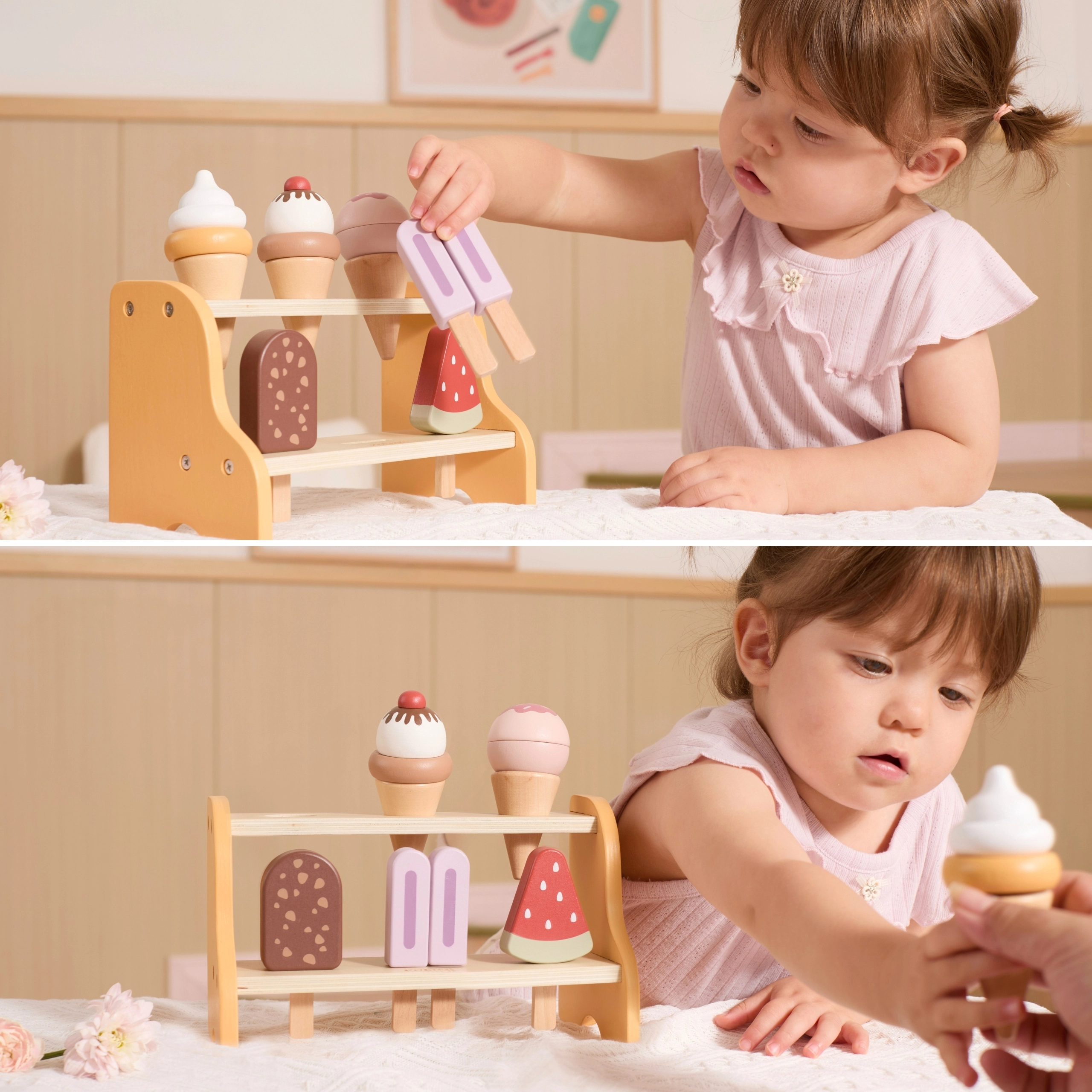 Der stabile Ständer hält alle Waffeln und Eis am Stiel an ihrem Platz, unterstützt Ordnung und visuelle Übersicht beim Kaufladen-Spiel.