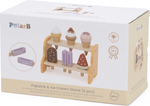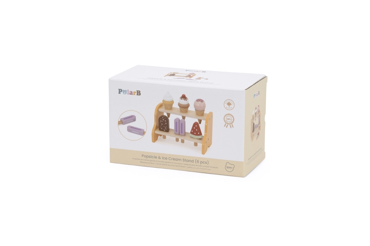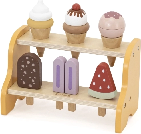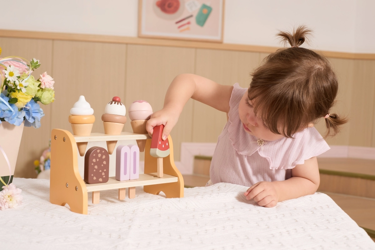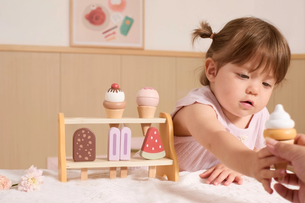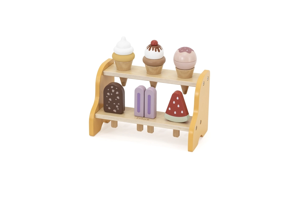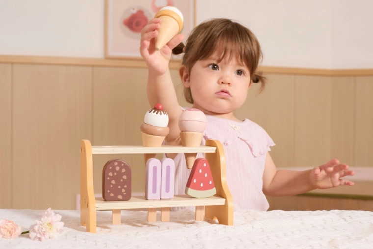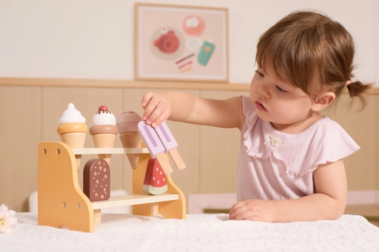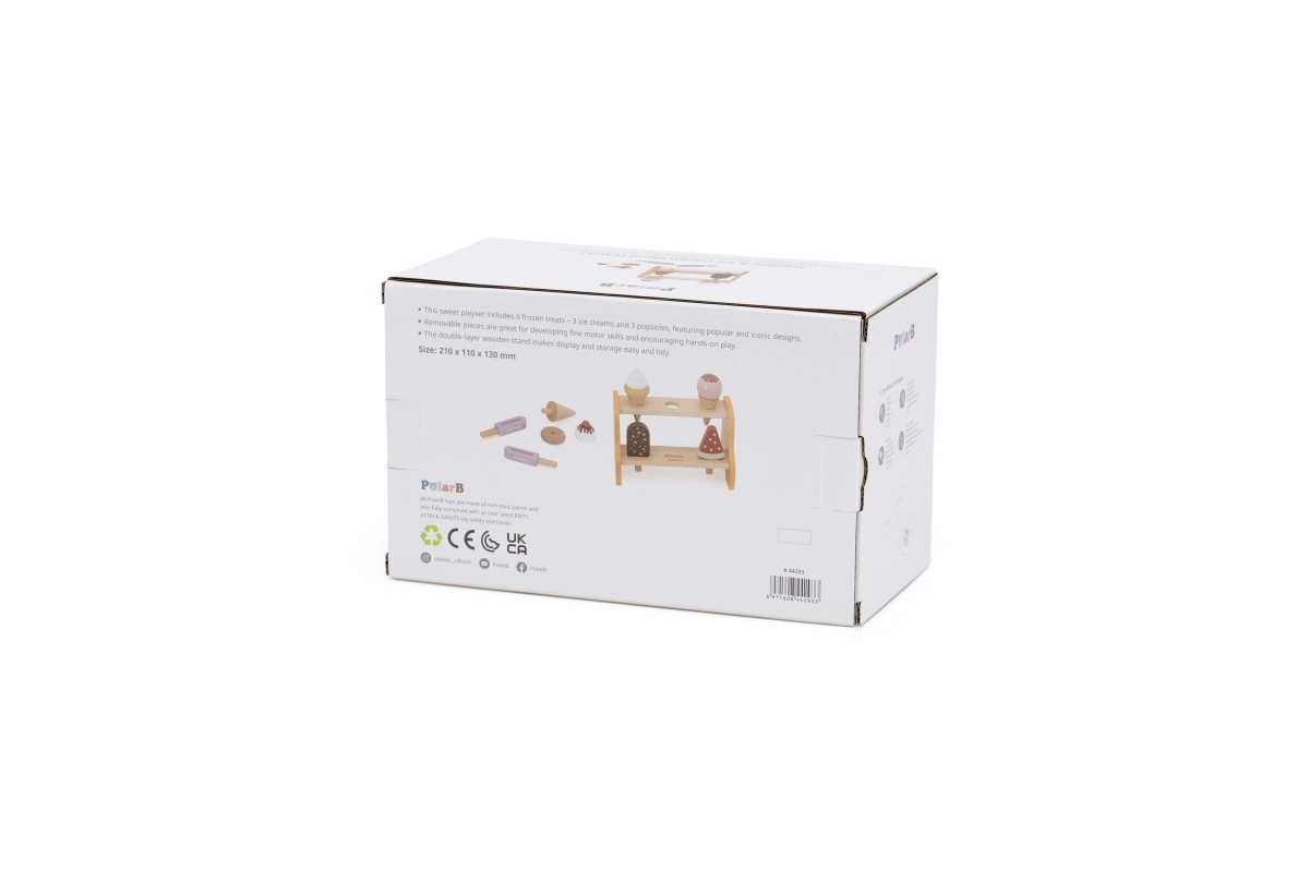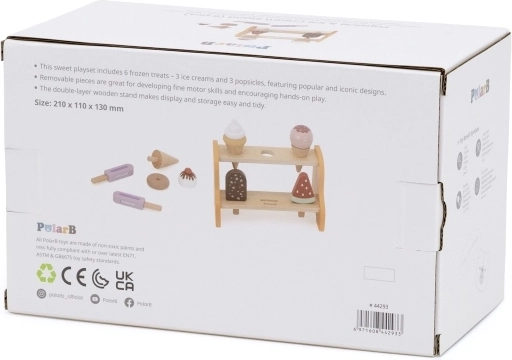 Der praktische zweistöckige Ständer hält alle Waffeln und Eis am Stiel an ihrem Platz. Kinder lernen spielerisch zu sortieren, aufzuräumen und „Waren“ wie in einer echten Eisdiele zu präsentieren.