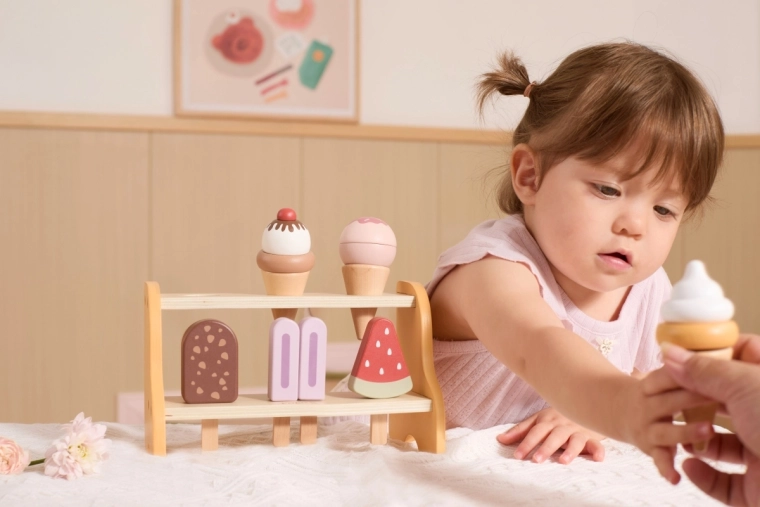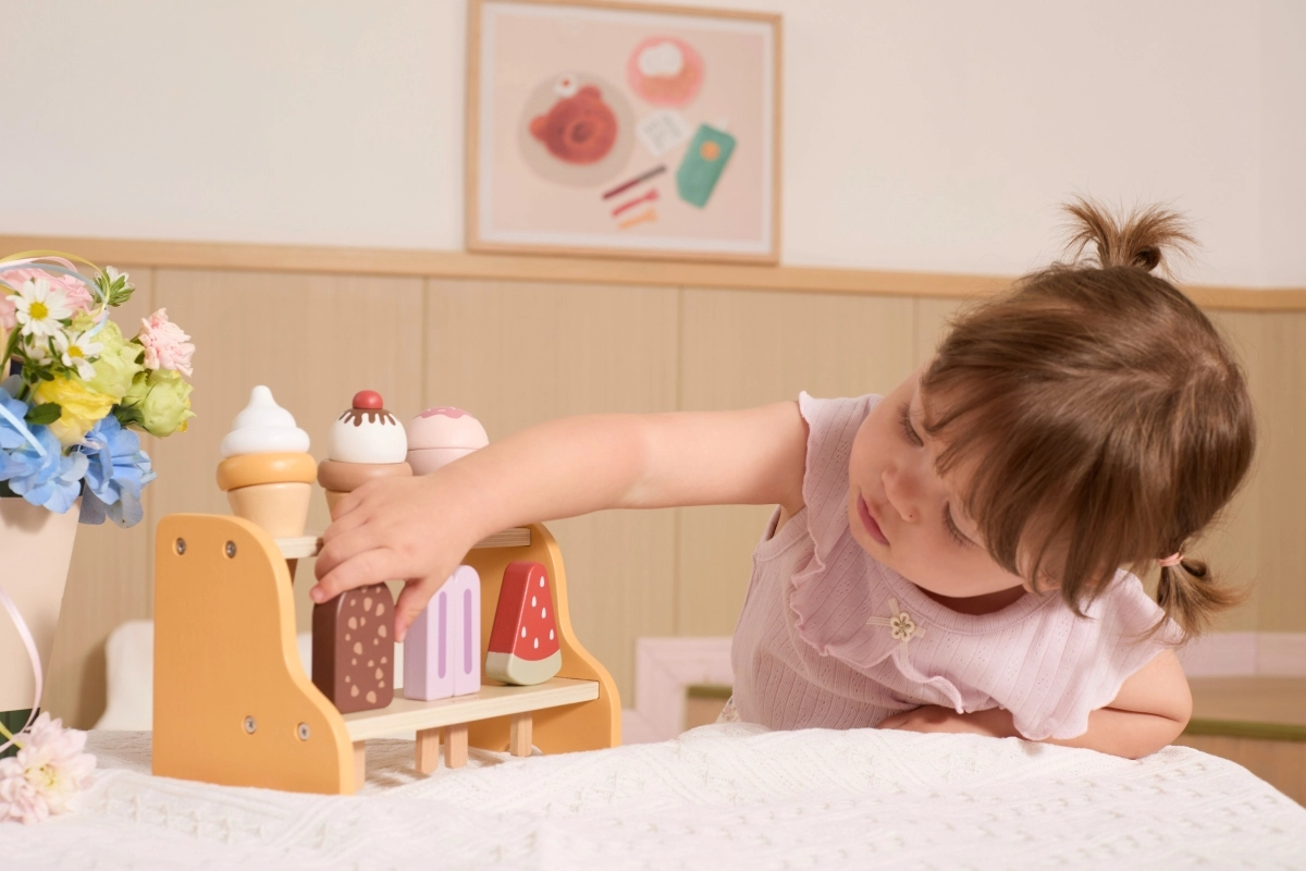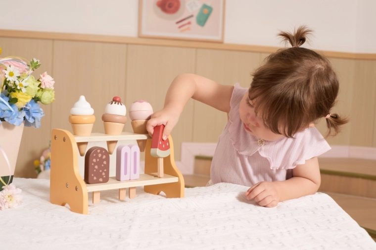 Das Eisdielen-Spiel fördert Feinmotorik, die Hand-Auge-Koordination sowie soziale Fähigkeiten beim gemeinsamen Verkaufen und Einkaufen. Dank der herausnehmbaren Teile trainieren Kinder Greifen, Sortieren und Ordnung, während realistische Formen und Farben Vorstellungskraft und Kreativität anregen.