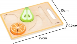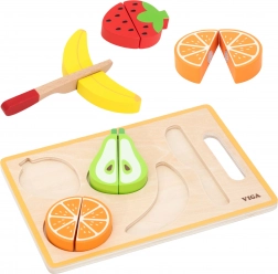 Das hölzerne Obstschneideset von VIGA ist die perfekte Ergänzung für die Kinderküche. Farbige, robuste Obststücke werden durch Klett zusammengehalten, der beim Schneiden angenehmen Widerstand und ein realistisches Gefühl bietet. Kinder können so sicher Kochfähigkeiten ausprobieren und zugleich Geschicklichkeit und Vorstellungskraft entwickeln.