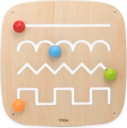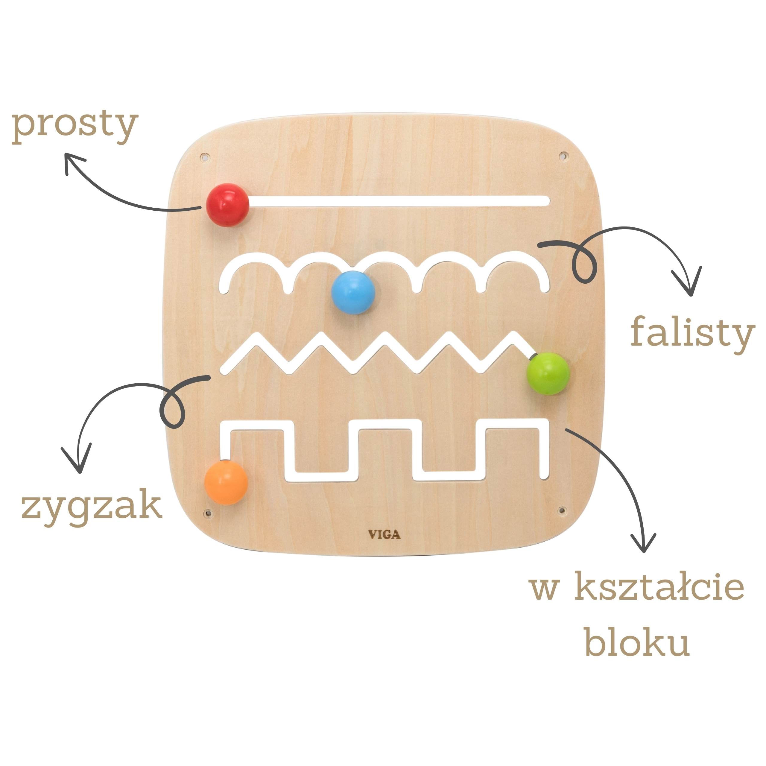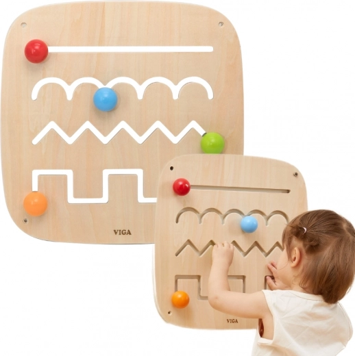 Die VIGA Holztafel verwandelt das tägliche Spiel in eine sinnvolle Aktivität. Kinder schieben Kugeln durch verschiedene Bahnen, entdecken Geraden, Wellen, Zickzacks und Blockformen, trainieren den Griff, die Bewegungsgenauigkeit und lernen Begriffe wie Kurven und Winkel. Natürliches Holz, abgerundete Ecken und eine feste Befestigung sorgen für Sicherheit bei jeder Berührung.