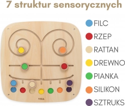 Sieben einzigartige Texturen und kräftige Farben führen Kinder zur Unterscheidung von Oberflächen, Farben und Formen und stärken so auf natürliche Weise die Sinneswahrnehmung und Konzentration.