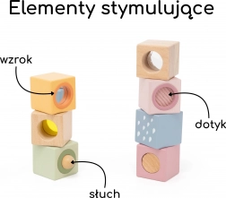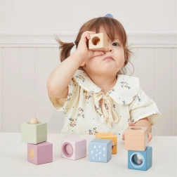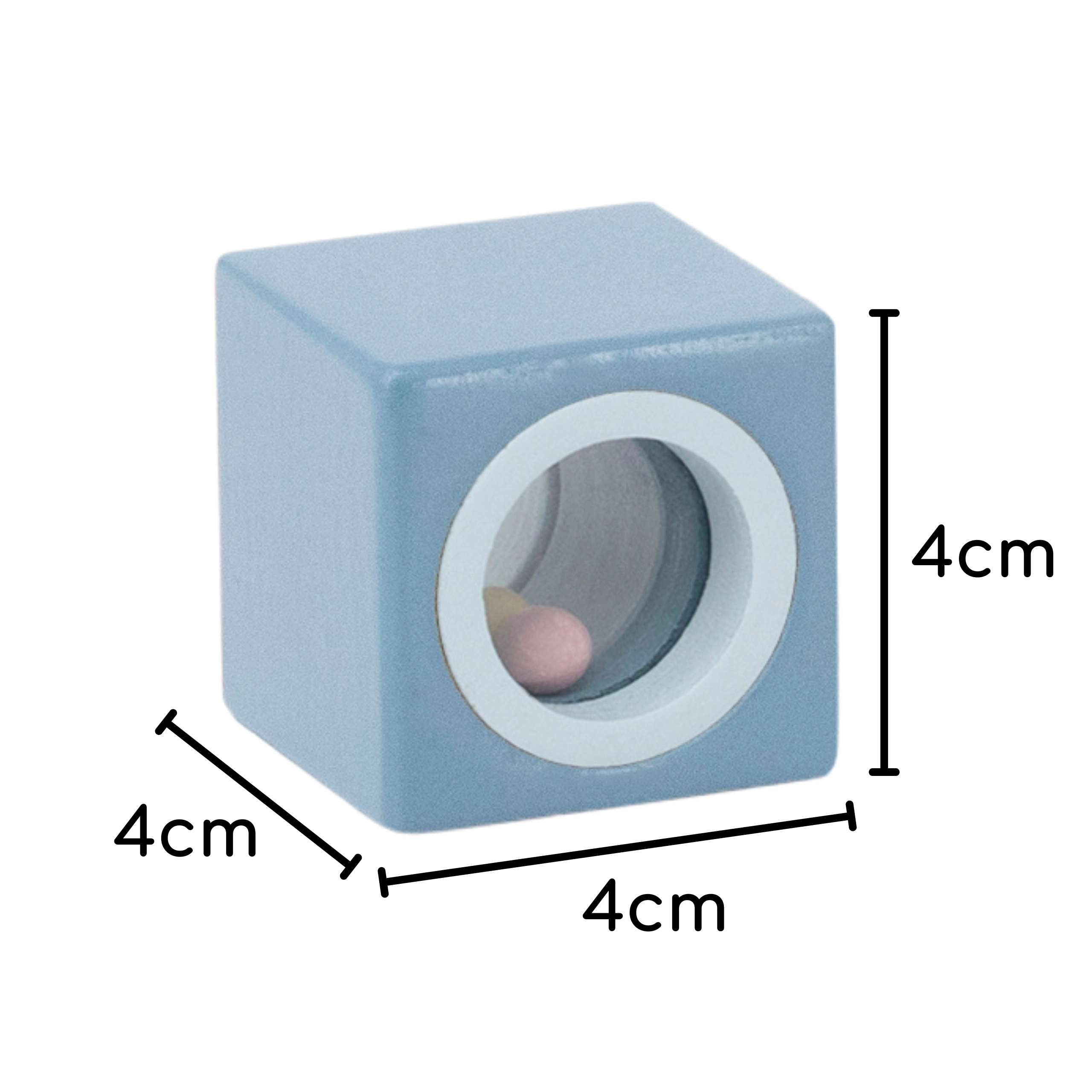 Jeder Baustein enthält ein einzigartiges Element zur multisensorischen Stimulation – vom Spiegel über die Rassel bis hin zu haptischen Strukturen. Dank der handlichen Maße lassen sie sich leicht greifen, fördern die Hand-Auge-Koordination, die Feinmotorik und unterstützen kreatives freies Spiel.