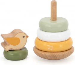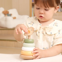 Der hölzerne Stapelturm mit dem niedlichen Vögelchen an der Spitze erfreut jedes Kleinkind. Bunte Ringe mit glatten Kanten lassen sich leicht greifen und in unterschiedlicher Reihenfolge stapeln. Das unterstützt das Unterscheiden von Farben und Größen sowie das Lösen von Problemen. Ein stabiler Sockel und angenehm abgerundete Formen sorgen für eine sichere Handhabung für kleine Hände.