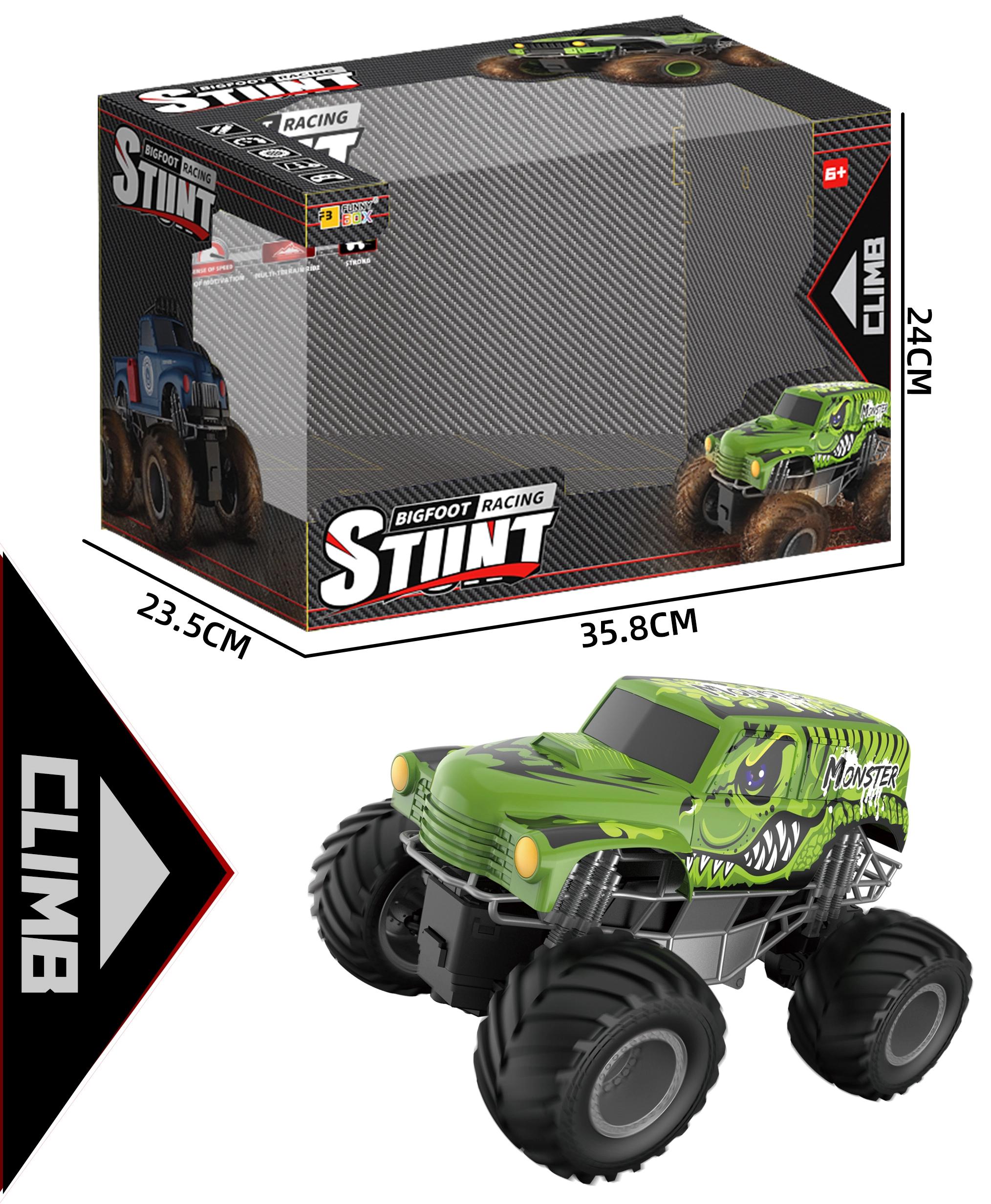 Das RC-Auto Monster bietet ein hervorragendes Preis‑Leistungs‑Verhältnis. Dank der 27‑MHz‑Frequenz lässt es sich leicht steuern und bewältigt auch gröbere Untergründe. Mit einer Laufzeit von 15–20 Minuten und einer Reichweite von 10–15 Metern ist actionreicher Fahrspaß garantiert. Einen praktischen ON/OFF-Schalter finden Sie sowohl an der Unterseite des Autos als auch am Controller.
