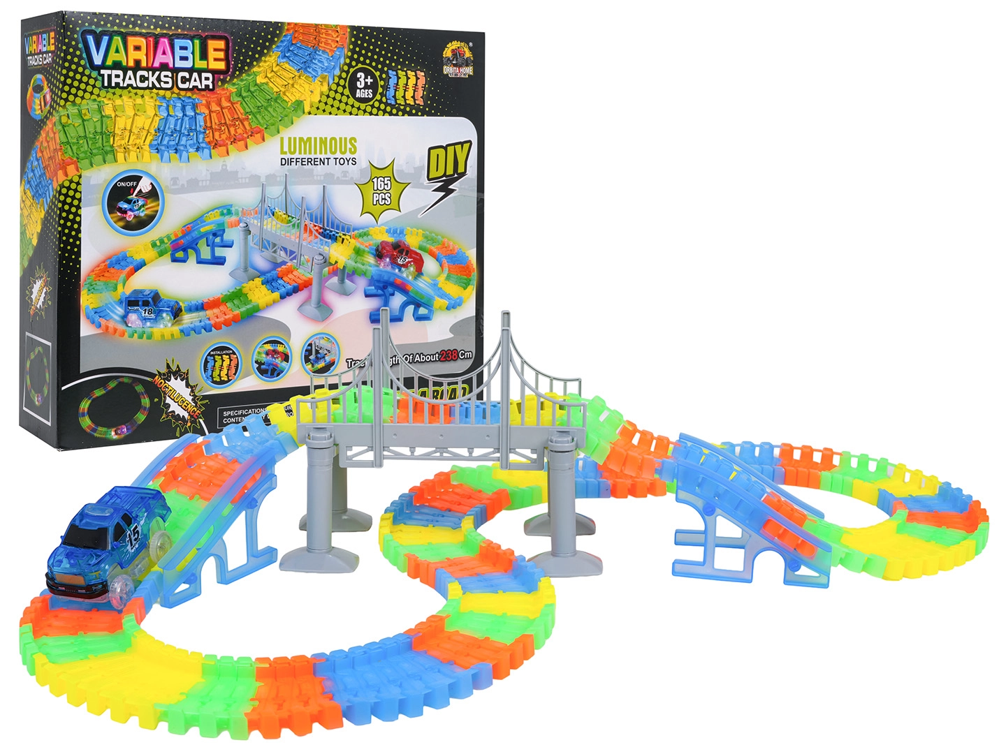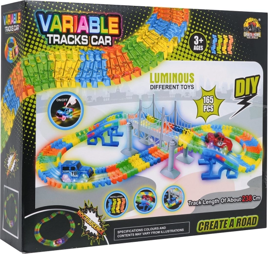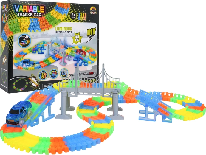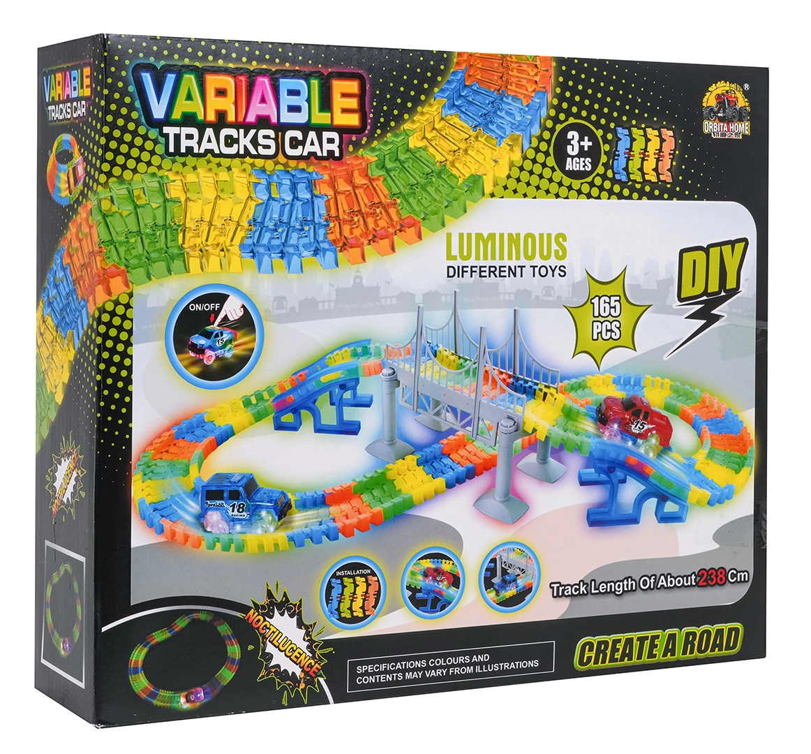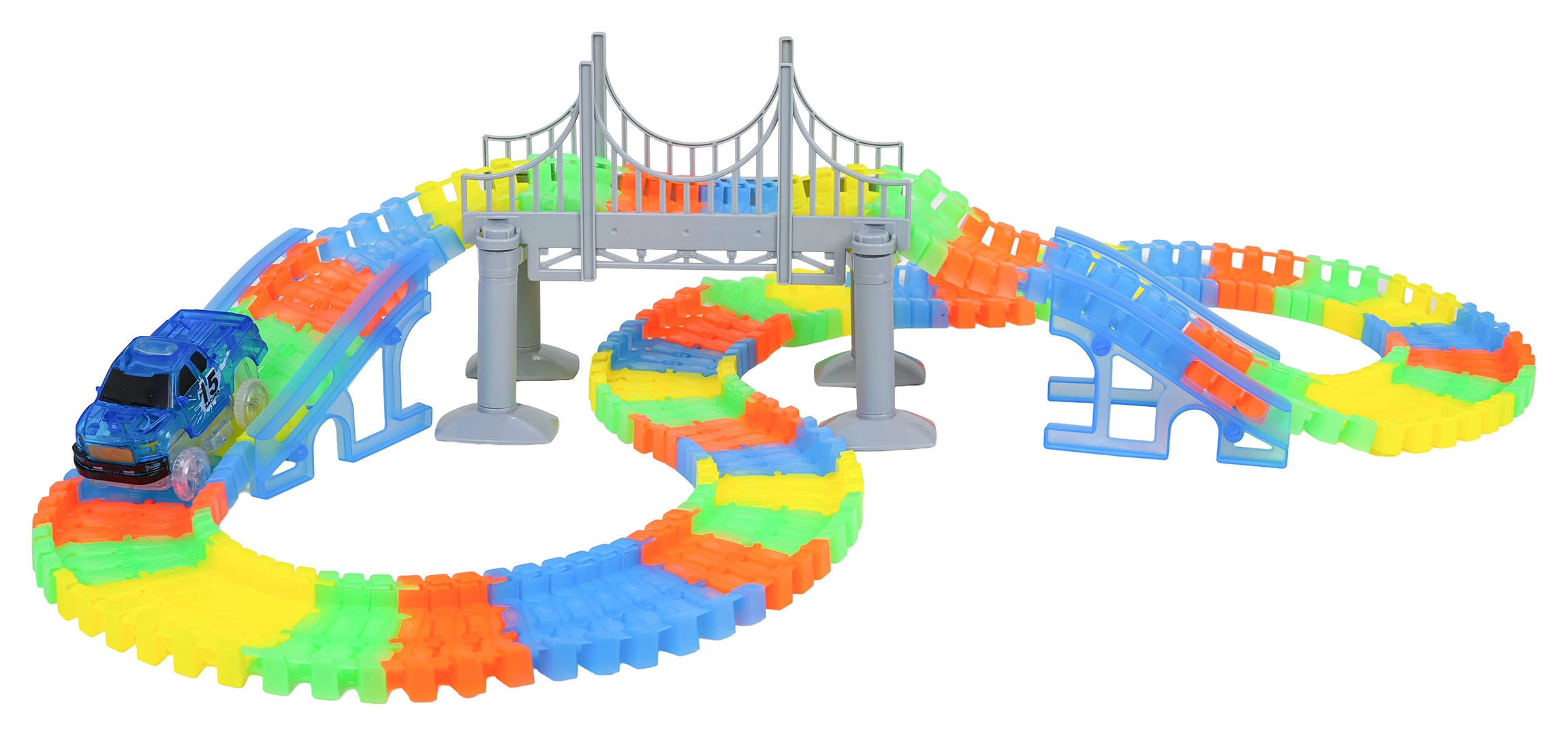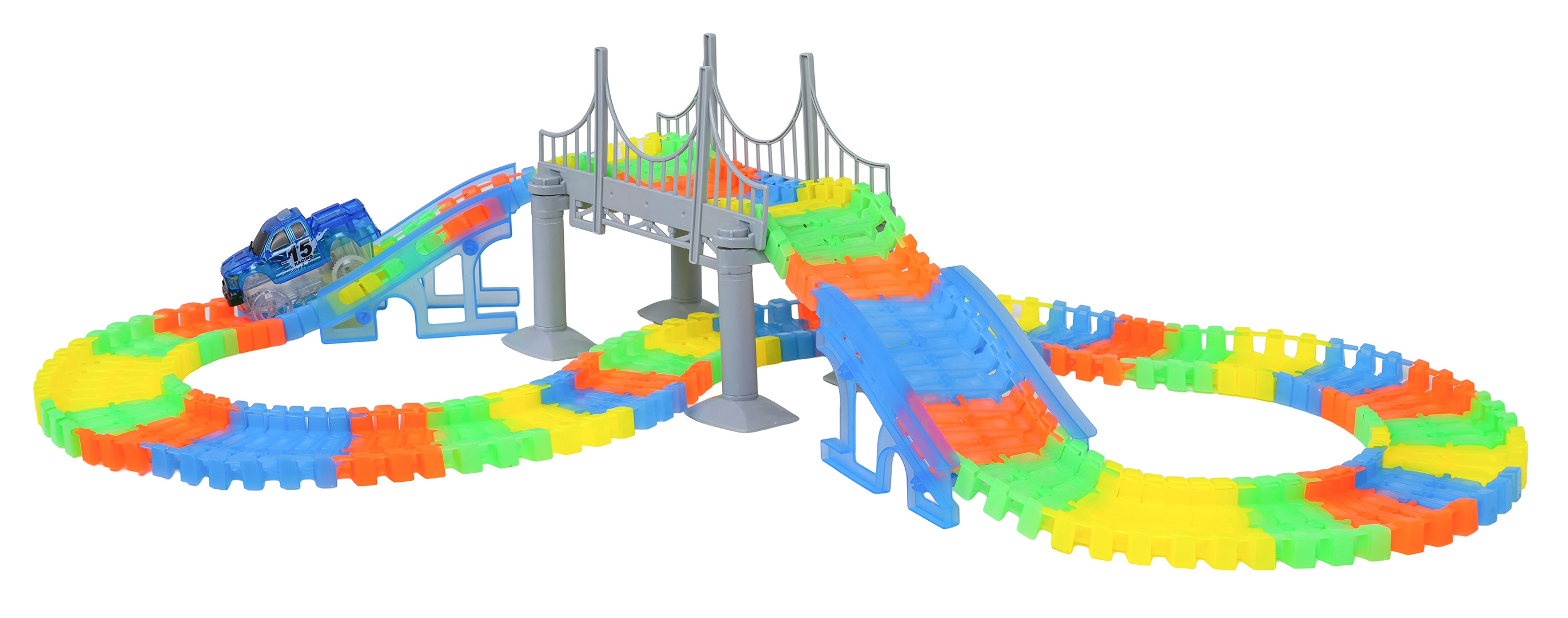 Diese kreative Rennbahn bietet Kindern ab 3 Jahren stundenlangen fantasievollen Spielspaß. Die Teile lassen sich leicht zusammenklicken, die Strecke ist bieg- und drehbar, sodass Sie Brücken, Rampen und wagemutige Kurven gestalten können. Die fluoreszierende Ausführung der Schienen lässt das Zimmer nach dem Ausschalten der Lichter erstrahlen.
