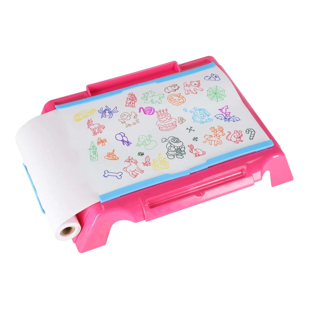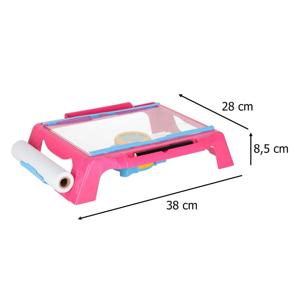 Fördern Sie die Kreativität von Kindern mit diesem rosa Zeichentisch mit Projektor. Dank der Motivprojektion, der Papierrolle, Klammern zur Papierbefestigung und dem umfangreichen Set aus Filzstiften und Buntstiften können Kinder ganz einfach bis zu 72 Vorlagen nachzeichnen und wunderschöne Bilder gestalten – zu Hause und unterwegs.