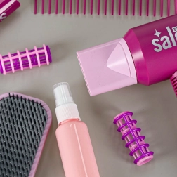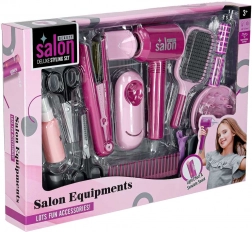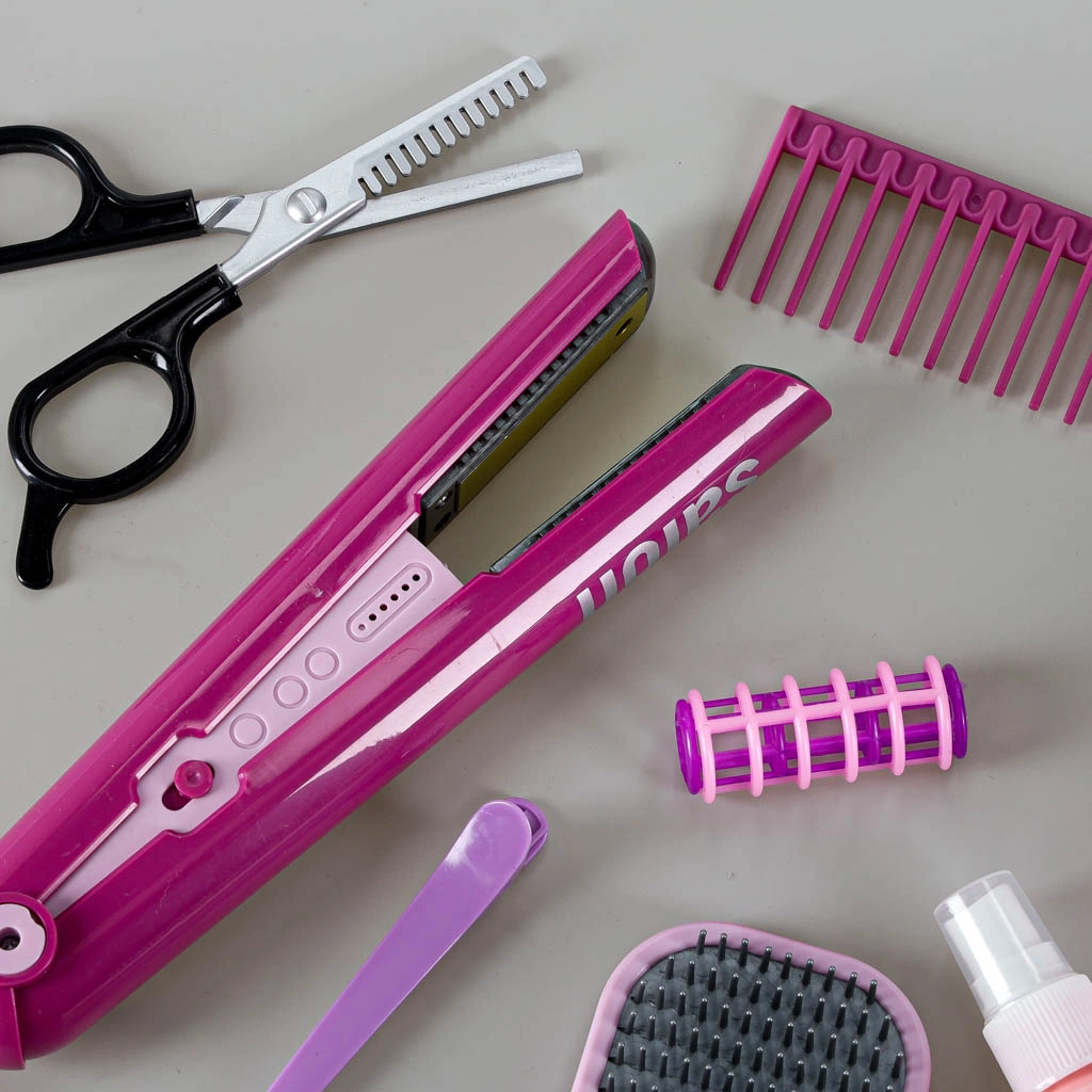 Im Set ist alles für eine komplette Verwandlung enthalten: ein Föhn mit zwei Aufsätzen (Konzentratordüse und Diffusor), ein Kinder-Glätteisen mit Ständer, Bürste und Kamm, 2 Arten schneidfreier Scheren, Lockenwickler und Clips sowie eine leere Flasche für „Styling“. Das gesamte Set ist leicht, robust und sicher für Kinder ab 3 Jahren.