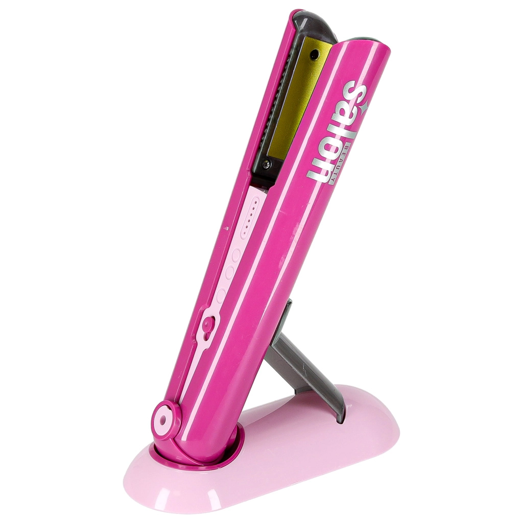 Das Kinder-Glätteisen leuchtet und gibt beim Drücken einen Ton ab, erwärmt sich jedoch nicht. Sicherer Spielspaß und realistisches Aussehen fördern das kreative Spielen.