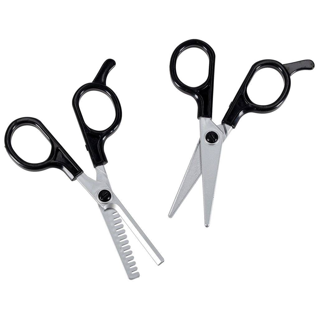 Bürste, Kamm, schneidfreie Scheren, Effilierschere, Lockenwickler, Clips und eine leere Flasche – die komplette Ausstattung für alltägliche Friseurgeschichten.