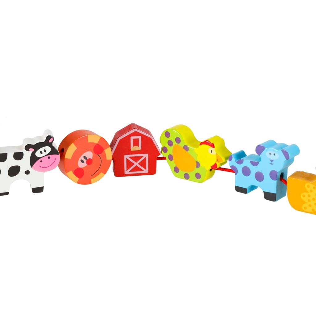 Dieses farbenfrohe Holzset mit Bauernhofmotiven verbindet Spiel und Lernen. Kinder können Tiere, Scheune, Traktor und weitere Teile auf die Schnur auffädeln, Szenen auf der beiliegenden Tafel legen und so Motorik, logisches Denken und Fantasie entwickeln. Glatt verarbeitete, robuste Teile liegen perfekt in kleinen Kinderhänden.