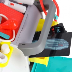 Im Set finden Sie alles Nötige für kleine Ärztinnen und Ärzte: Stethoskop (leuchtet und gibt Geräusche von sich), Blutdruckmessgerät, Ultraschall (leuchtet), Taschenlampe (leuchtet), elektronisches Thermometer (leuchtet und gibt Geräusche von sich), Zahnendoskop (leuchtet), Pulsoximeter, neurologischer Reflexhammer, Schere, Zange und Pinzette, Skalpell, Spritze, Medizinbox, Schreibunterlage mit Klemme und 6 Röntgen- und EKG-Aufnahmen.