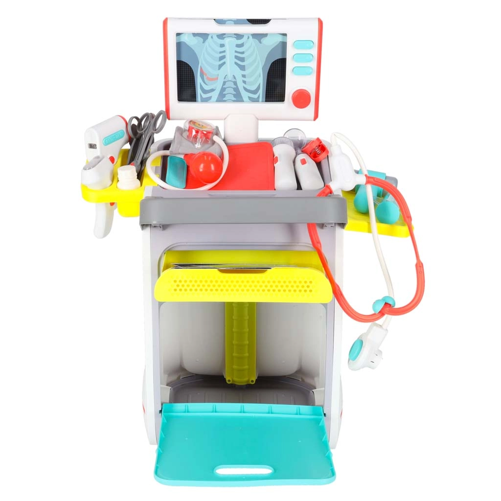 Das Hauptpanel spielt Melodien ab, die Instrumente leuchten und geben Geräusche von sich. Kinder probieren echte ärztliche Abläufe in sicherer Spielform aus.