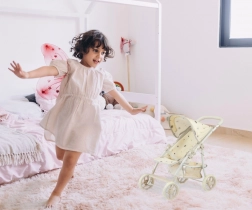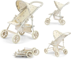 Dank des Metallrahmens und flachen Klappmechanismus lässt sich der Wagen leicht transportieren und verstauen. Der Textilbezug aus Polyester ist abnehmbar und waschbar, sodass der Wagen auch bei täglicher Nutzung sauber bleibt. Die Arretierung gegen unbeabsichtigtes Zusammenklappen sorgt für unbeschwertes und sicheres Spielen.
