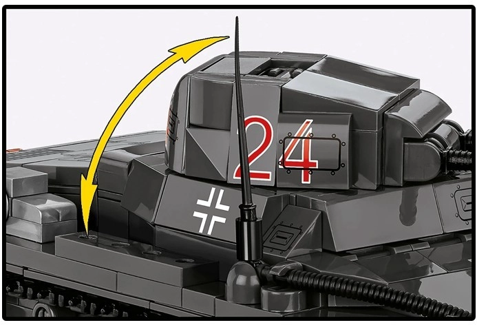 Ein um 360° drehbarer Turm, verstellbare Bewaffnung sowie realistische Ketten mit Rädern ermöglichen dynamische Szenen, sanfte Bewegung und eine attraktive Präsentation des Modells.