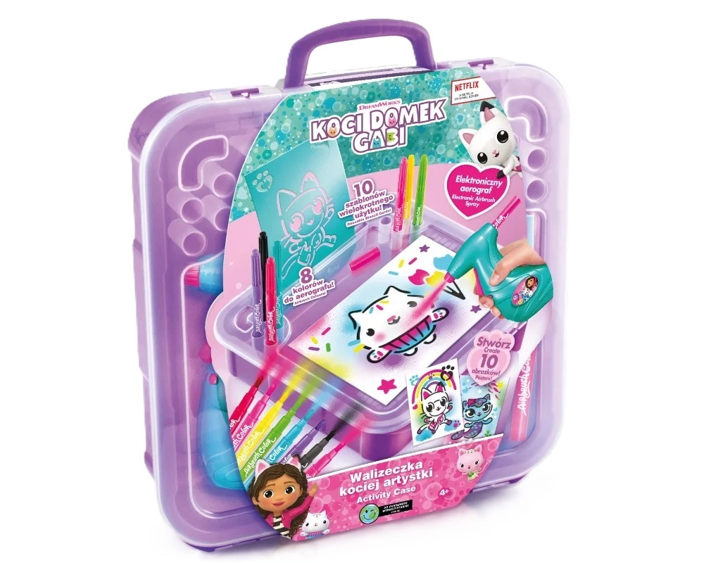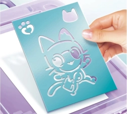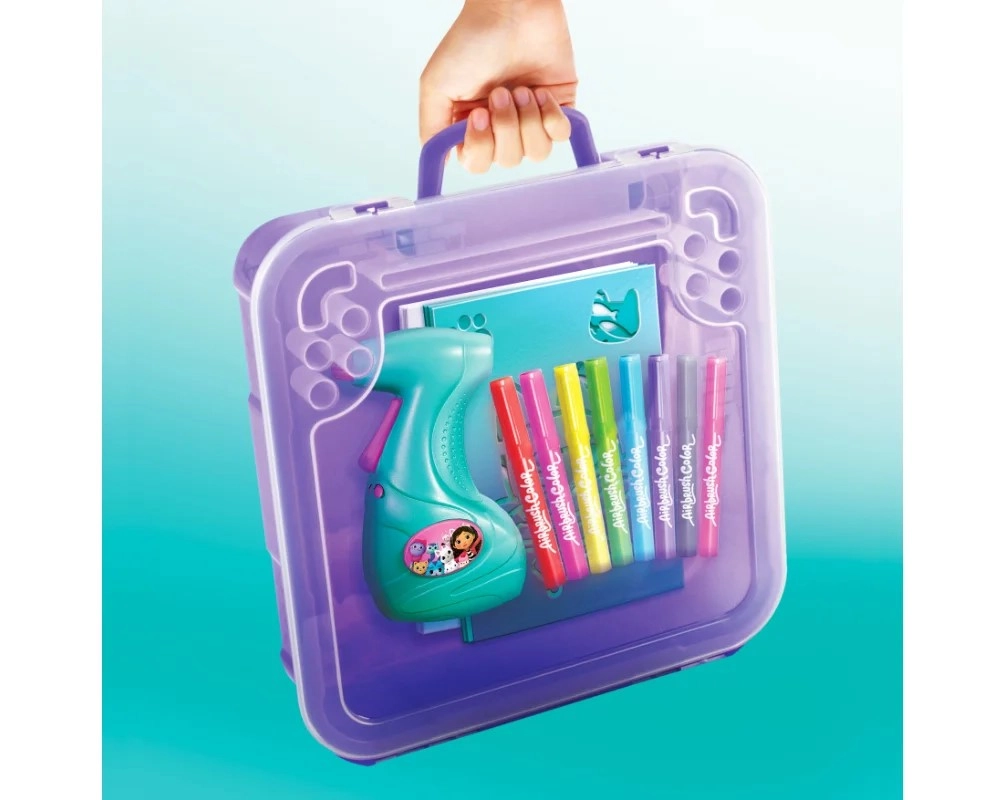 Im Koffer ist alles enthalten, was man zum Gestalten origineller Bilder braucht: elektronischer Airbrush, 8 Stifte, 10 Schablonen, 10 Blatt Papier und ein Stickerbogen. Die Schablonen sind wiederverwendbar, sodass Kinder immer neue Motive kreieren und ihre Vorstellungskraft weiterentwickeln können.