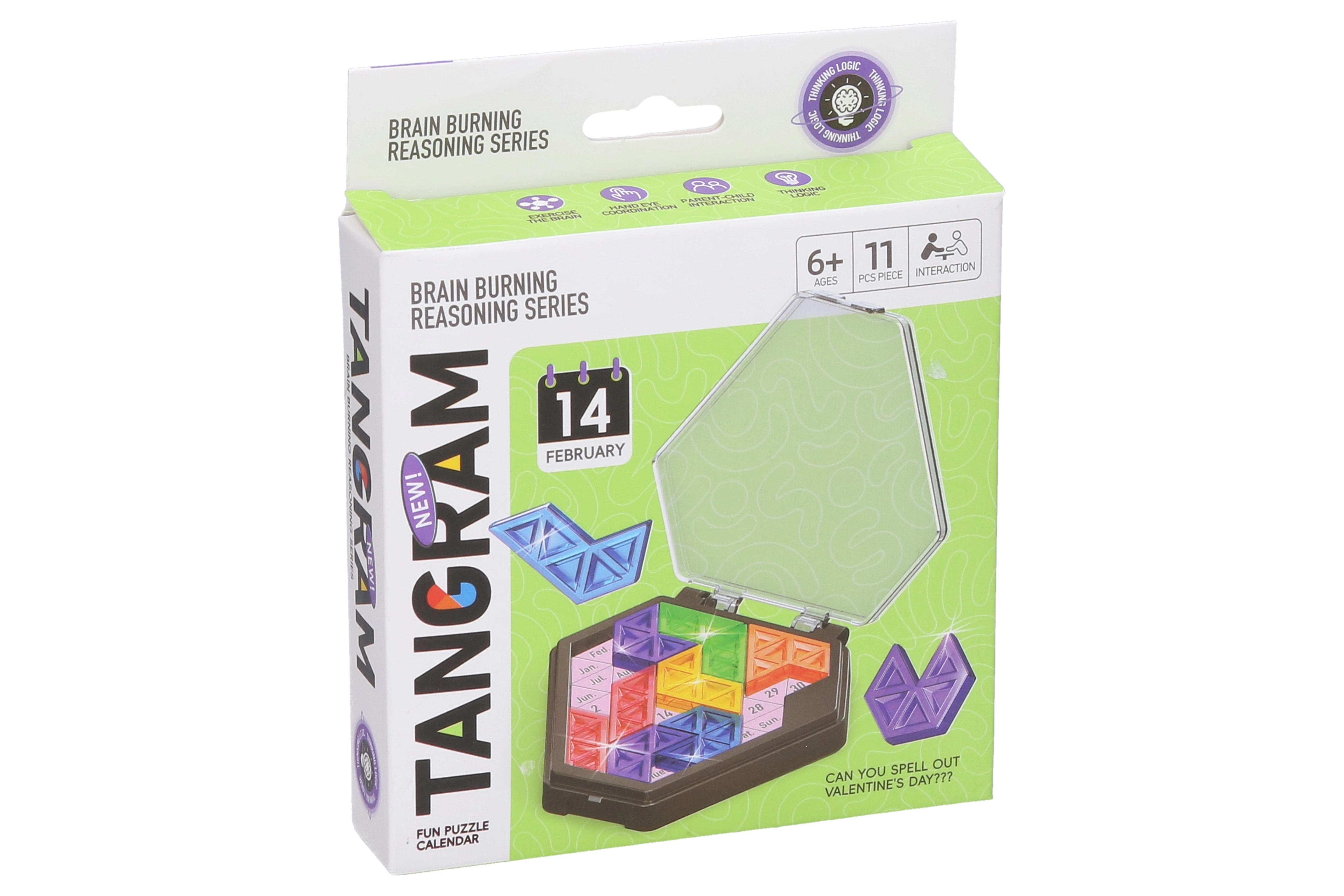 Entdecken Sie eine clevere und unterhaltsame Möglichkeit, Logik und Vorstellungskraft zu trainieren – mit diesem Tangram-Puzzle mit einem Durchmesser von 10 cm. Enthalten sind Schablonen zum Legen verschiedener Figuren sowie konkreter Daten (Muttertag, Valentinstag u. a.). Ziel ist es, die Teile so zu legen, dass nur ein bestimmtes Datum und der Wochentag sichtbar bleiben. Erhältlich in 2 Varianten – Schwarz und Weiß.