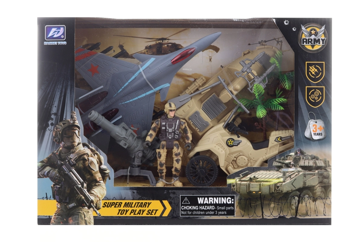 Der Set-Inhalt umfasst eine Soldatenfigur, ein Jagdflugzeug, ein Motorrad und einen Wasserscooter, ergänzt durch kleines Zubehör für ein noch realistischeres Spiel. Die kompakte Verpackung eignet sich auch ideal als Geschenk.