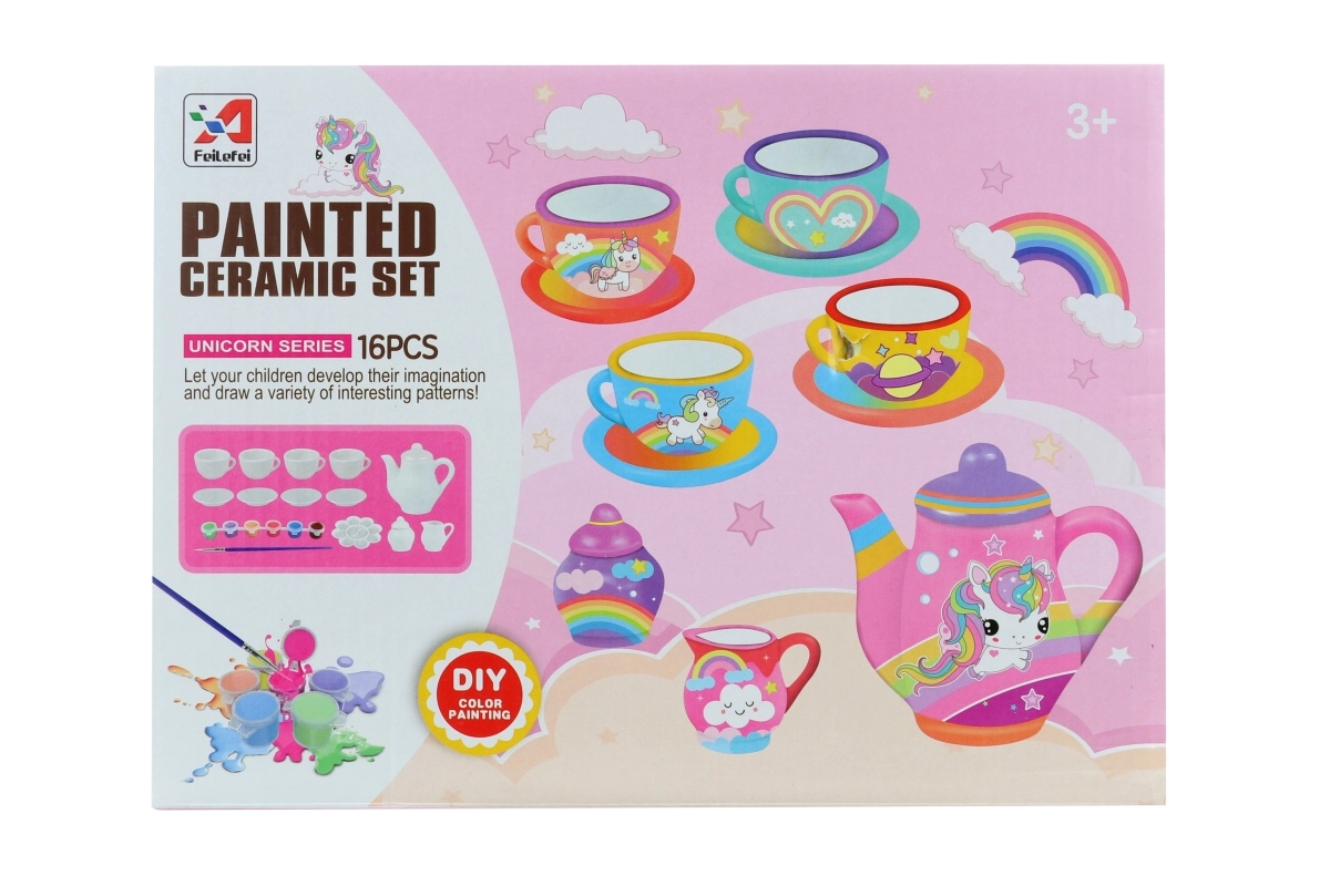 Schenken Sie Kindern Freude am Gestalten und Spielen in einem. Das Mal-Teeset mit Einhörnern ist ideal für kleine Künstler, die ihr eigenes Keramikservice verzieren und anschließend damit spielen möchten. Dank des vollständigen Zubehörs können Kinder sofort losmalen und einzigartige Designs kreieren.