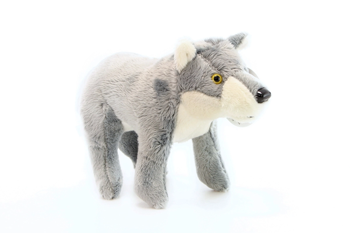 Dieser Plüschwolf überzeugt mit detaillierter Verarbeitung und einem angenehmen Material, das zum Kuscheln einlädt. Dank der stehenden Position wirkt er realistisch und eignet sich nicht nur fürs Kinderzimmer, sondern auch als Dekoration für Naturliebhaber.