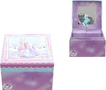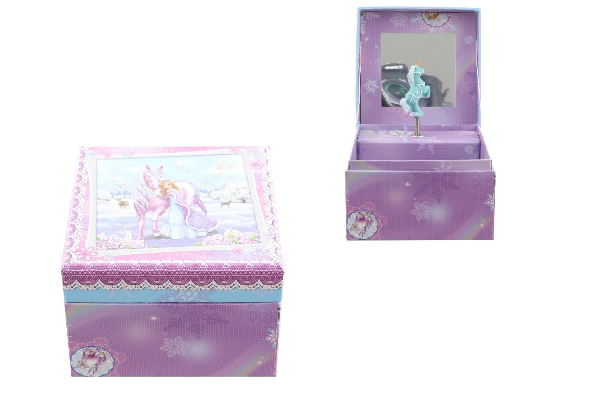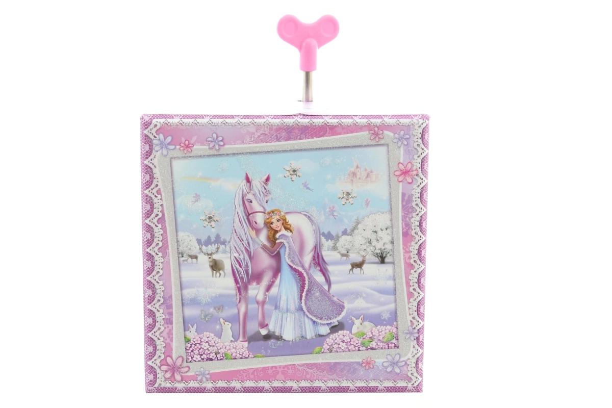 Das bezaubernde Spieluhr-Schmuckkästchen mit Prinzessinnenmotiv und Pferd verwandelt jedes Zimmer in ein märchenhaftes Königreich. Nach dem Aufziehen dreht sich im Inneren eine Einhornfigur, die elegant zur Melodie tanzt. Der innere Spiegel erleichtert das Anprobieren von Schmuck und Accessoires.