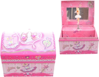 Dieses bezaubernde Schmuckkästchen in Truhenform ist der ideale Ort zur Aufbewahrung von Ringen, Ohrringen und anderen kleinen Schätzen. Nach dem Aufziehen und Öffnen des Deckels dreht sich die Ballerina vor dem Spiegel, und eine Melodie schafft eine magische Atmosphäre.