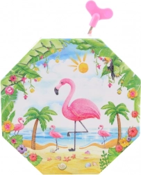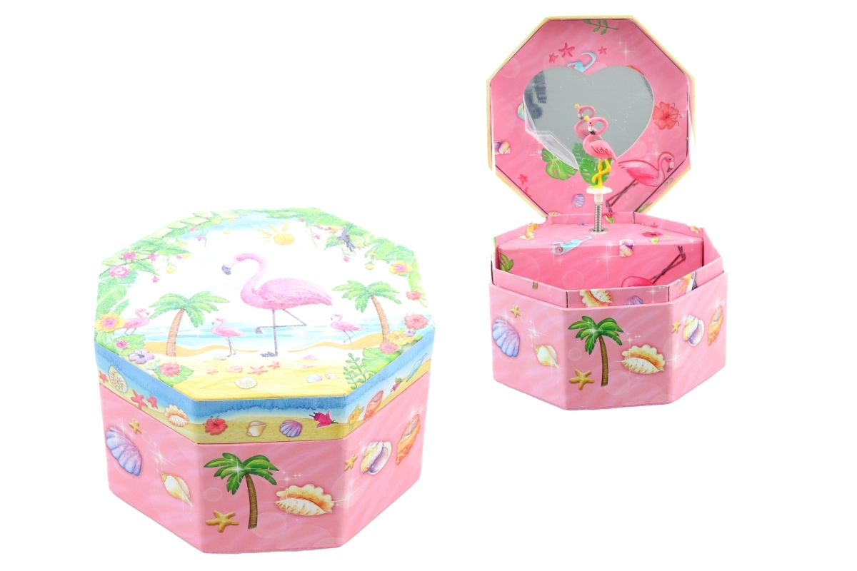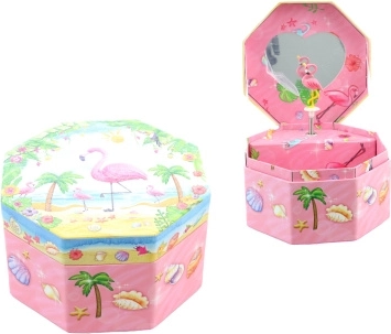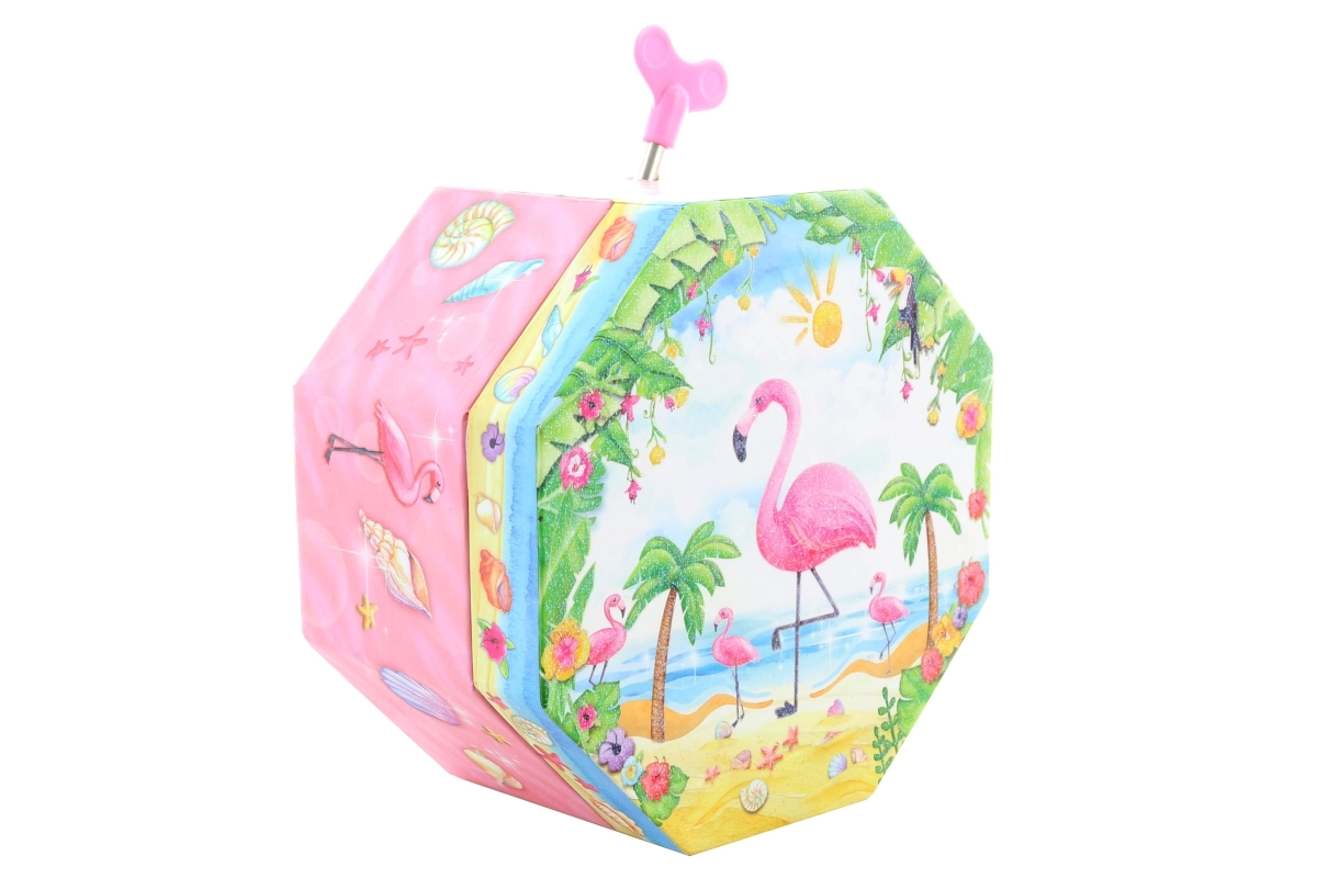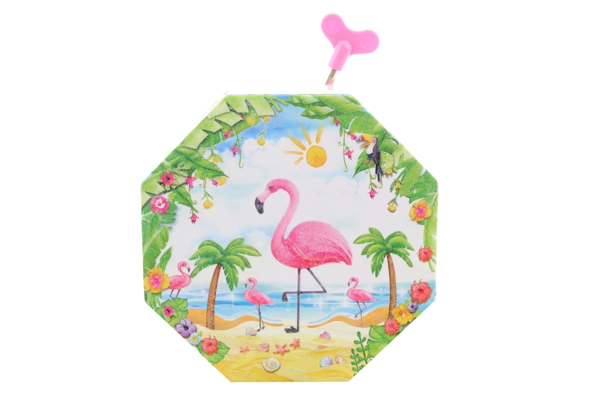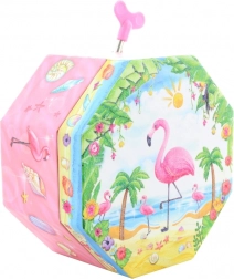 Dieses bezaubernde Musik-Schmuckkästchen in Rosa zeichnet sich durch eine achteckige Form und ein tropisches Motiv mit Flamingo, Palmen und Muscheln aus. Beim Öffnen erscheint ein tanzender Flamingo vor einem Herzspiegel, der sich nach dem Aufziehen des Schlüssels dreht und das Verstauen von Schmuck mit einer angenehmen Melodie begleitet.