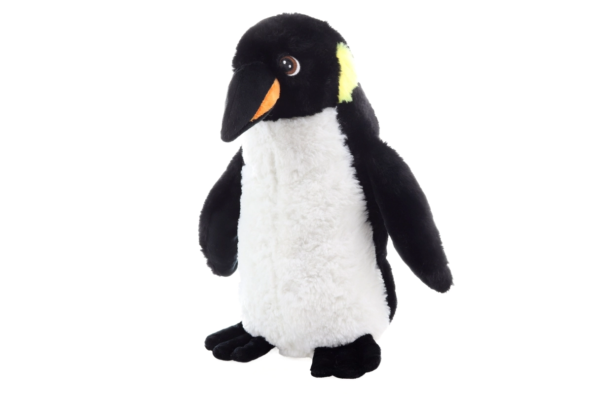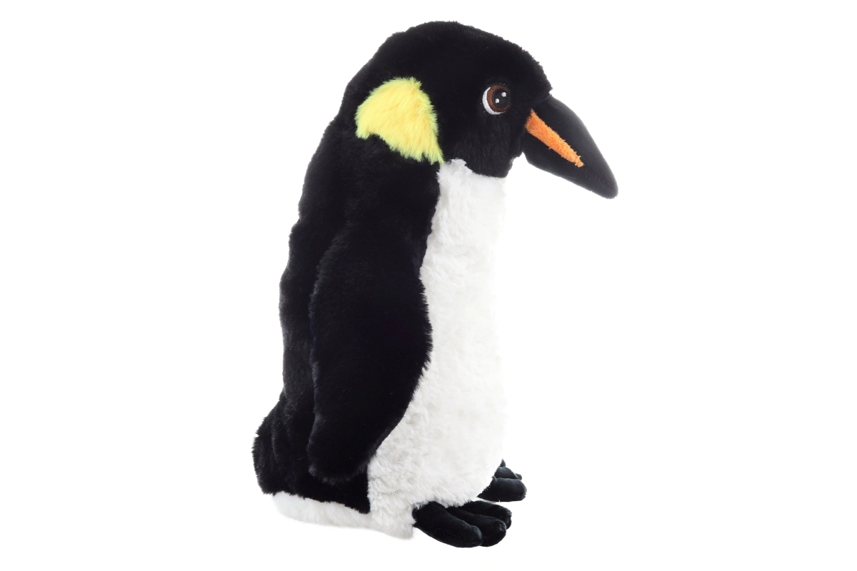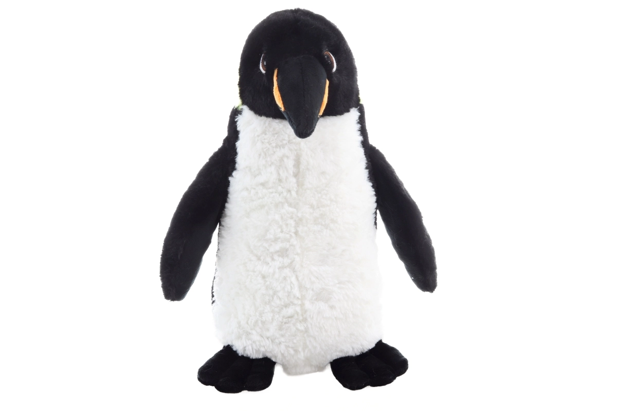 Die realistische Farbgestaltung mit weißem Bäuchlein, schwarzen Flügeln und kontrastierendem Schnabel regt die kindliche Vorstellungskraft an und unterstützt kreatives Spiel. Die Maße 30 × 23 × 17 cm machen ihn zum idealen Begleiter für unterwegs und im Bettchen.