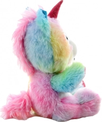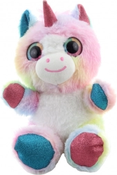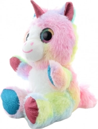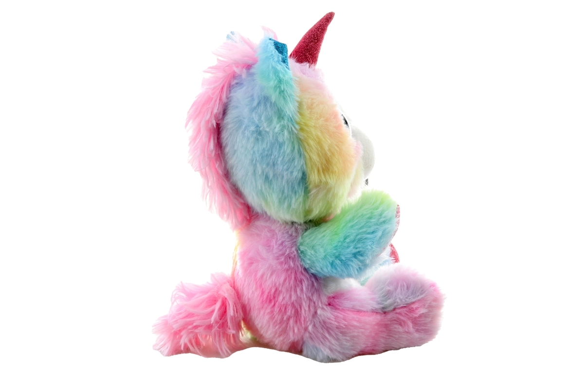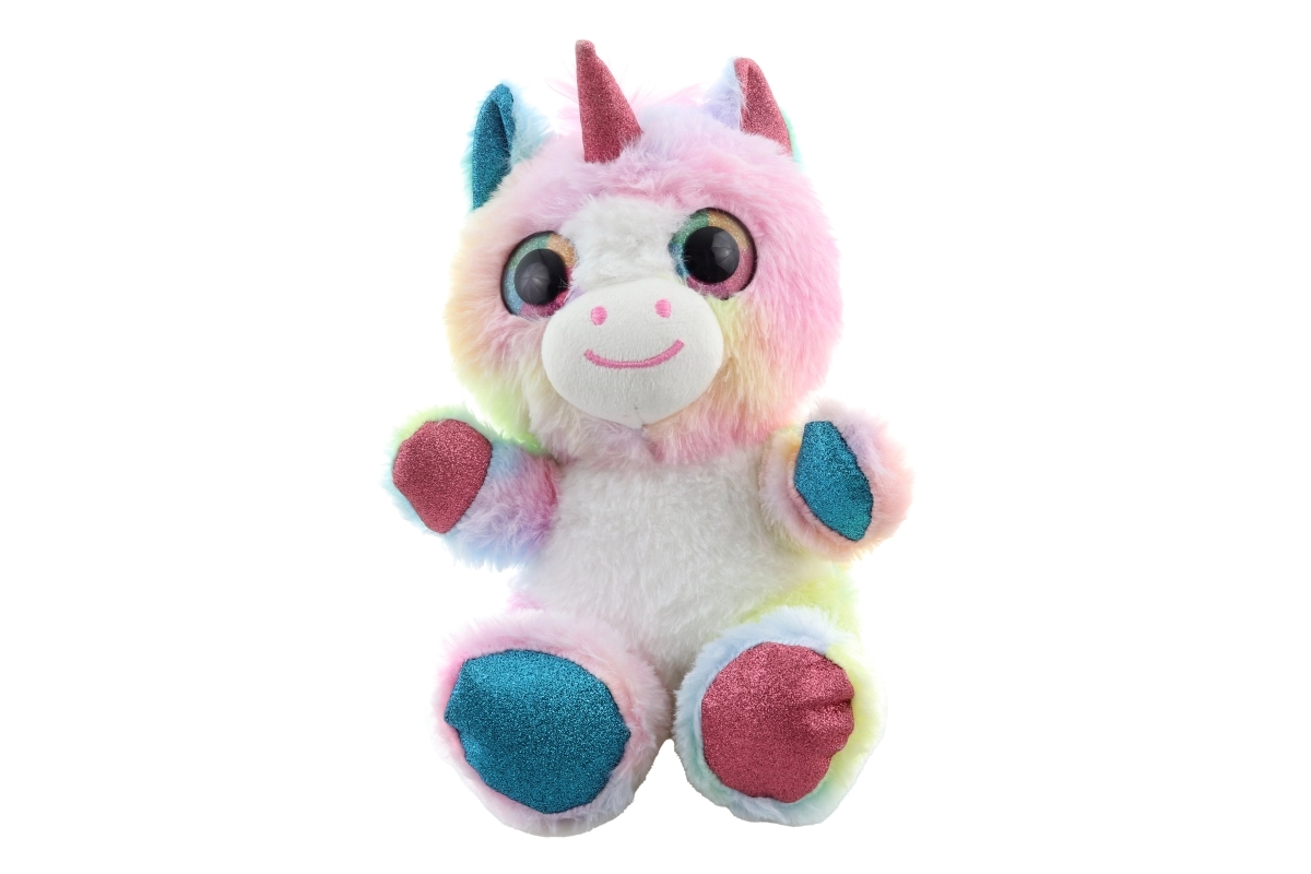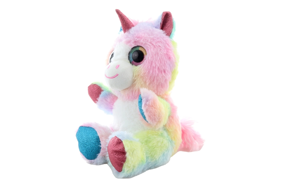 Dieses farbenfrohe Plüsch-Einhorn erobert Kinderherzen mit seiner weichen Oberfläche und dem zauberhaften Look. Pastellige Regenbogen-Töne, glitzernde Details an Horn, Ohren und Hufen sowie große gestickte Augen machen es zum perfekten Begleiter zum Spielen und Einschlafen.