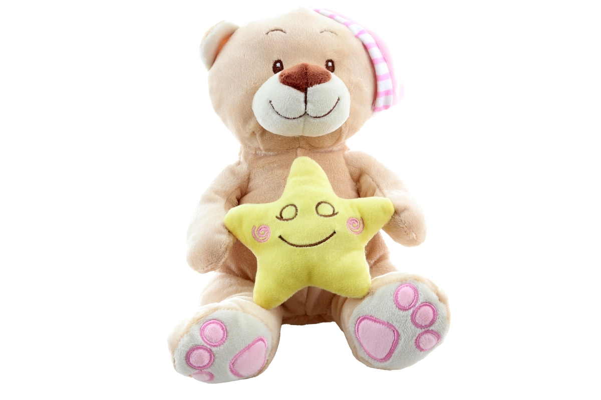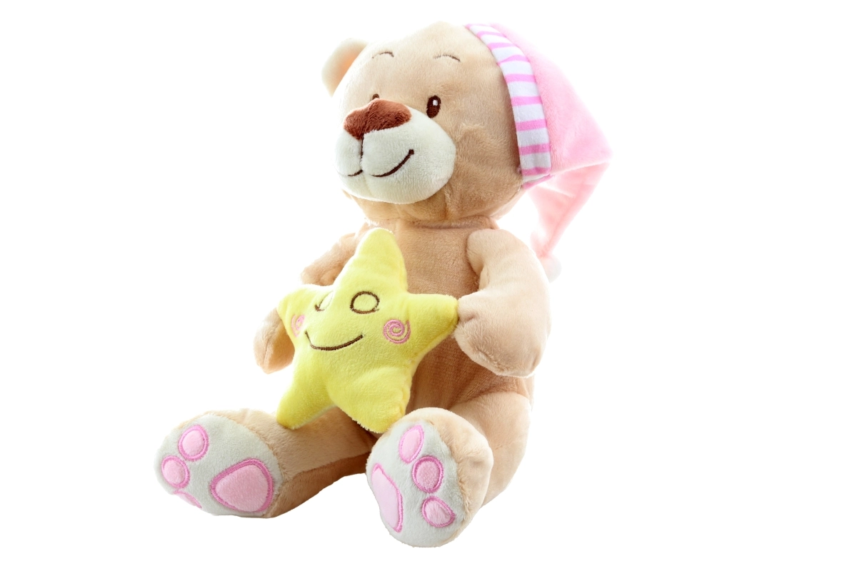Dieser samtweiche Bär mit rosa Schlafmütze und einem zarten gelben Stern in der Hand vermittelt Kindern Geborgenheit und einen ruhigen Schlaf. Dank hochwertiger Verarbeitung und gestickter Details ist er auch für Neugeborene geeignet.