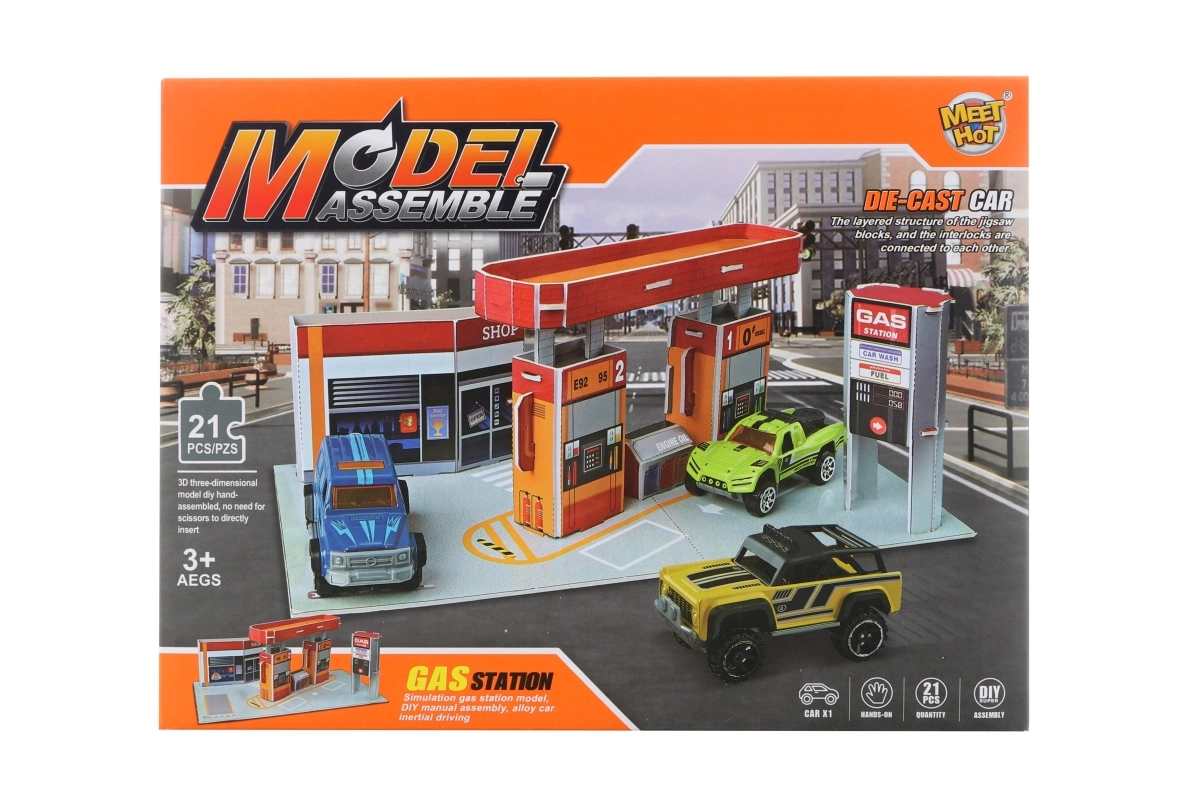 Die einzelnen Teile aus weicher Pappe lassen sich leicht verbinden und ergeben ein stabiles Tankstellenmodell mit praktischen Maßen zum Spielen auf Tisch oder Boden. Die gesamte Verpackung ist kompakt und eignet sich auch hervorragend als tolles Geschenk für kleine Auto- und Bauset-Liebhaber.