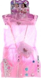 Krone, Stab, Halskette, Armbänder, Ohrringe, Ringe und Handtasche – alles auf rosafarbene Töne abgestimmt für ein perfektes Kostüm.