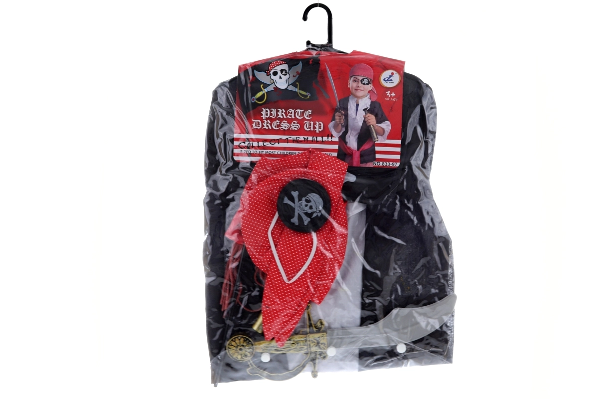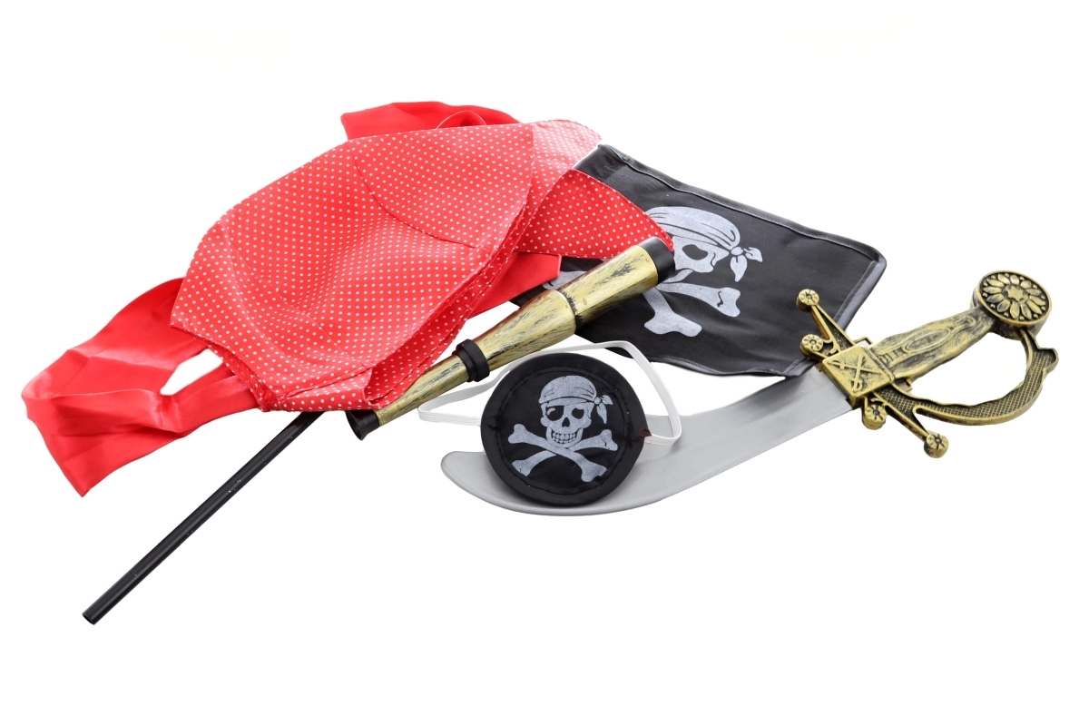 - Komplettset: Umhang, Shorts, Säbel, Flagge, Kopftuch, Gürtel und Augenklappe.