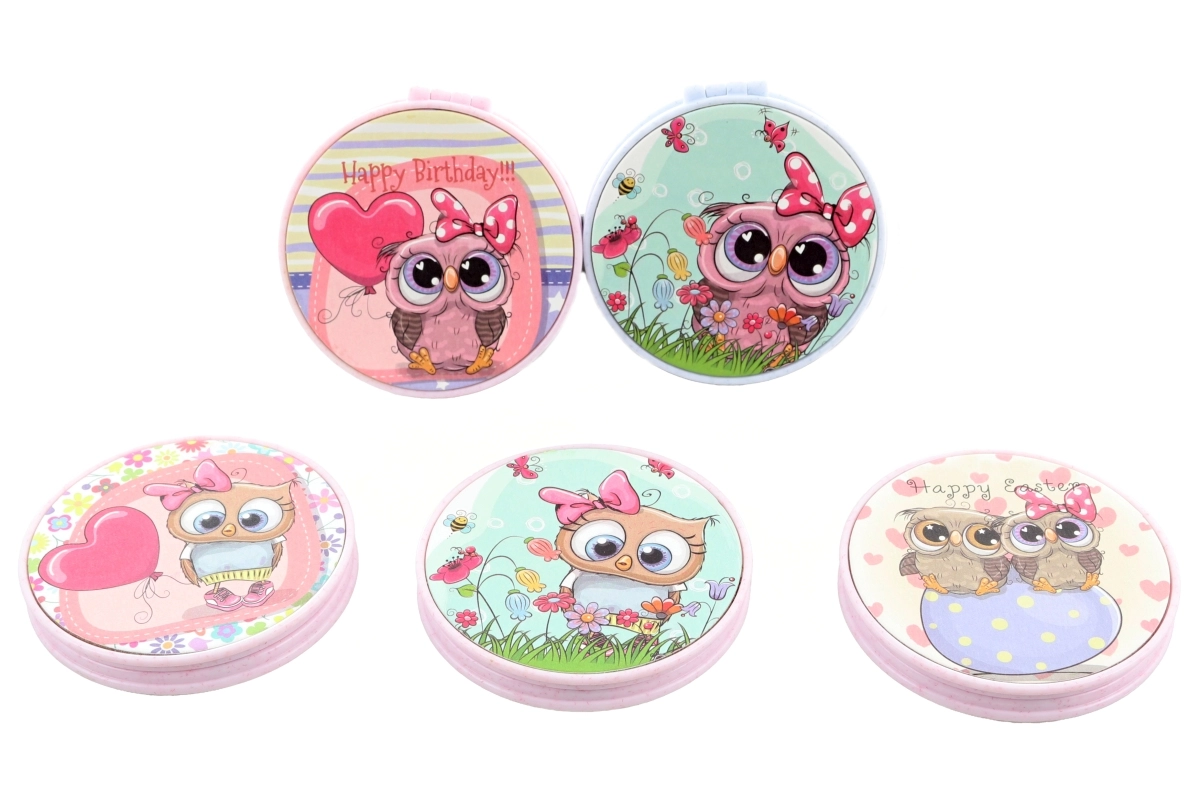 Der Spiegel verfügt über ein Kunststoffetui mit niedlichen Eulenprints und bietet nach dem Öffnen zwei Spiegelflächen für schnelle Korrekturen von Make-up oder Haaren. Wir liefern mehrere Motive je nach aktueller Lagerverfügbarkeit. Verpackt im Beutel.