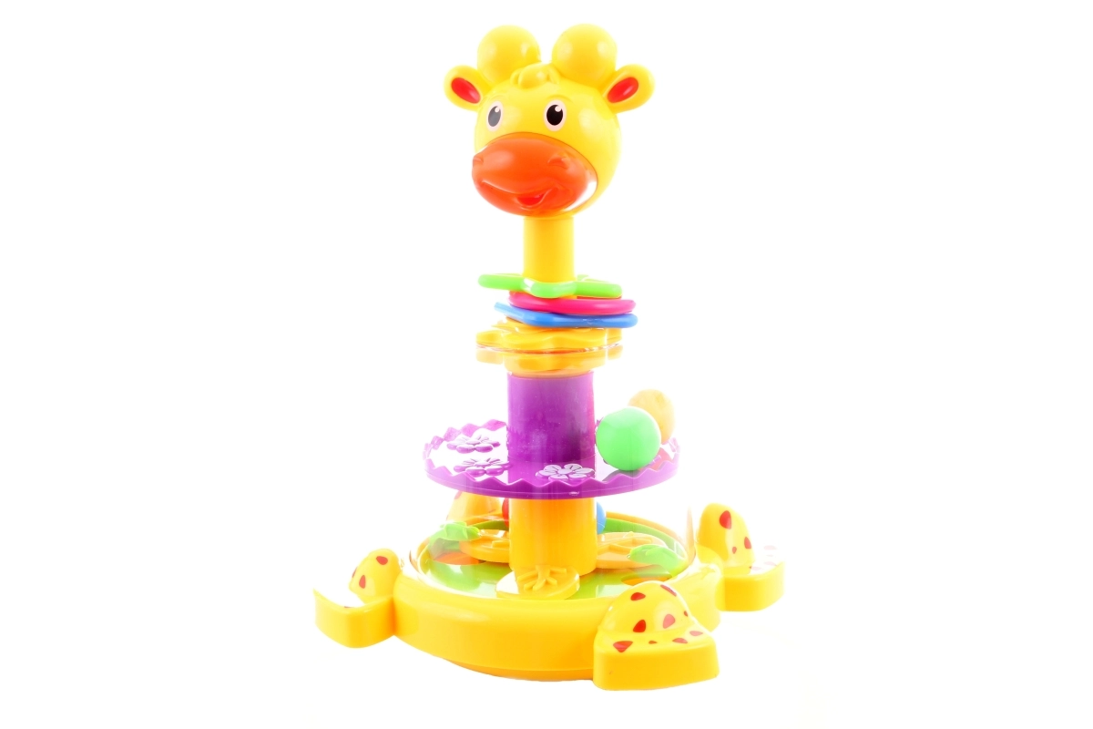 Intuitiver Mechanismus: Durch sanften Druck auf den Giraffenkopf drehen sich die bunten Kügelchen und Ringe in der transparenten Kammer.