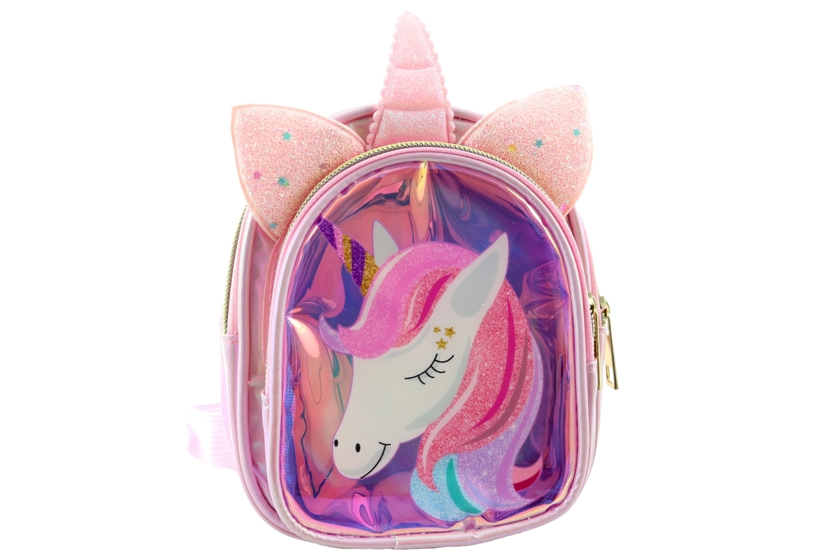 Die irisierende, glitzernde Oberfläche und die niedlichen 3D-Details (Ohren und Horn) machen den Rucksack zu einem besonderen Begleiter für jeden Tag.